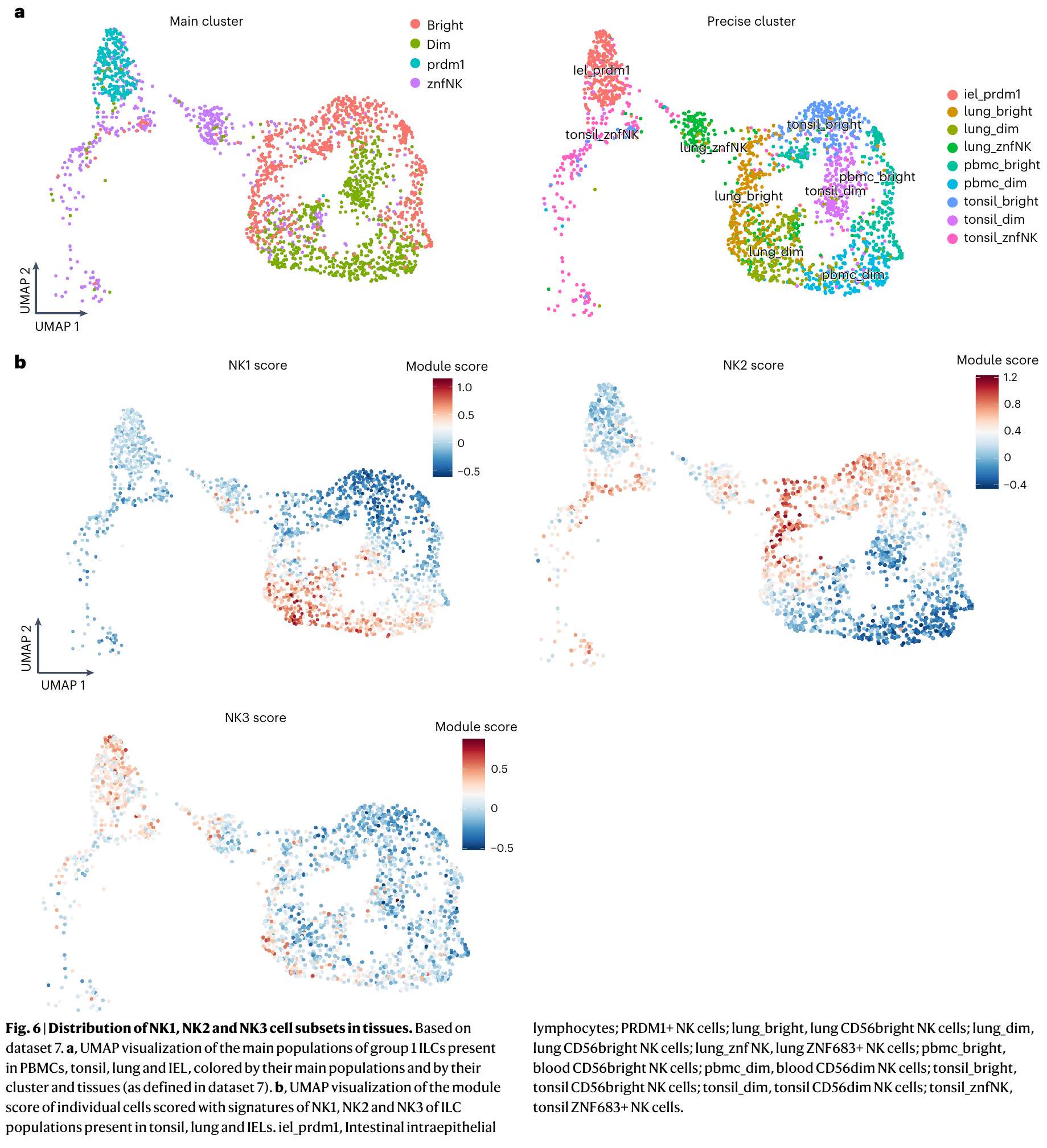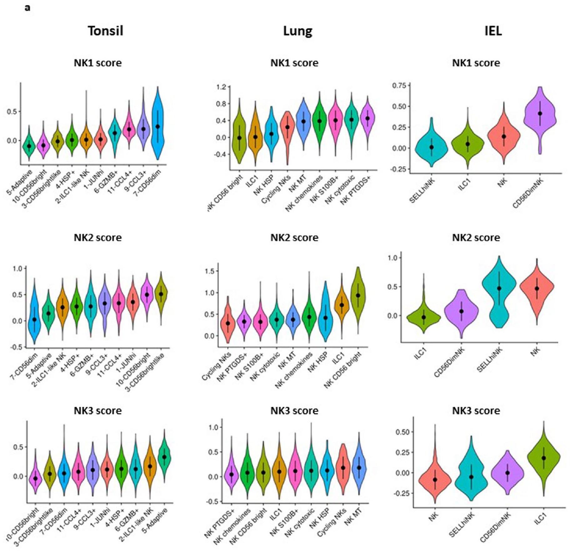 تظهر بياناتنا أيضًا أن ملفات الجينات لمجموعات NK1 و NK2 و NK3 تمتد إلى ما هو أبعد من الدم المحيطي للأفراد الأصحاء، مما سمح لنا بوصف تباين خلايا NK في الأنسجة. في الواقع، تمكنا من تحديد مجموعات خلايا NK1 و NK2 و NK3 في الرئة واللوزتين و IELs. كما تم توضيح أهمية ملفات NK1 و NK2 و NK3 من خلال التمييز بين مجموعات خلايا NK المتسللة إلى الأنسجة و ILC1s.