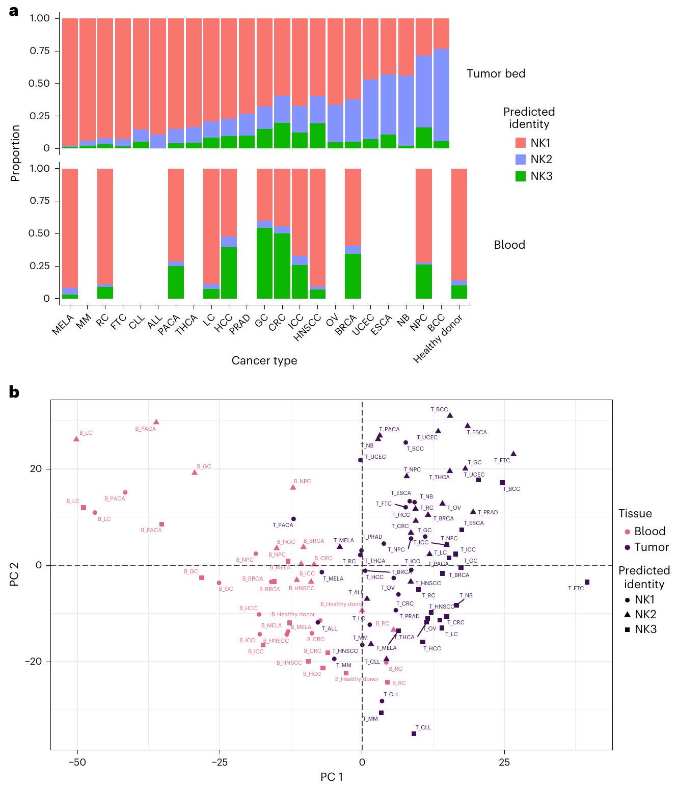 الشكل 7 | توزيع مجموعات خلايا NK1 و NK2 و NK3 في دم الأشخاص المصابين بالسرطان وفي سرير الورم. بناءً على مجموعات البيانات و 6. أ، رسم بياني عمودي يوضح نسبة المجموعات الثلاث الرئيسية من خلايا NK في الدم وفي سرير الورم في 22 نوعًا من السرطان ( عينات). ب، PCA على خلايا NK المتسللة إلى الورم والدم، مجمعة حسب مجموعة NK، ظروف السرطان والأنسجة. يعتمد PCA على متوسط مستويات التعبير لـ 2,000 جين الأكثر اختلافًا عبر الأنسجة والظروف. يتم تلوين المجموعات بناءً على نوع الأنسجة التي تنتمي إليها. PC1 و PC2 يفسران و من التباين، على التوالي ( عينات). MELA، ميلانوما؛ MM، ورم متعدد النخاع؛ RC، سرطان الكلى؛ FTC، سرطان قناة فالوب؛ CLL، اللوكيميا اللمفاوية المزمنة؛ ALL، اللوكيميا اللمفاوية الحادة؛ PACA، سرطان البنكرياس؛ THCA، سرطان الغدة الدرقية؛ LC، سرطان الرئة؛ HCC، سرطان الكبد الخلوي؛ PRAD، سرطان البروستاتا؛ GC، سرطان المعدة؛ CRC، سرطان القولون والمستقيم؛ ICC، سرطان القناة الصفراوية داخل الكبد؛ HNSCC، سرطان الخلايا الحرشفية في الرأس والعنق؛ OV، سرطان المبيض؛ BRCA، سرطان الثدي؛ UCEC، سرطان بطانة الرحم؛ ESCA، سرطان المريء؛ NB، الورم العصبي الدبقي؛ NPC، سرطان البلعوم الأنفي؛ BCC، سرطان الخلايا القاعدية.