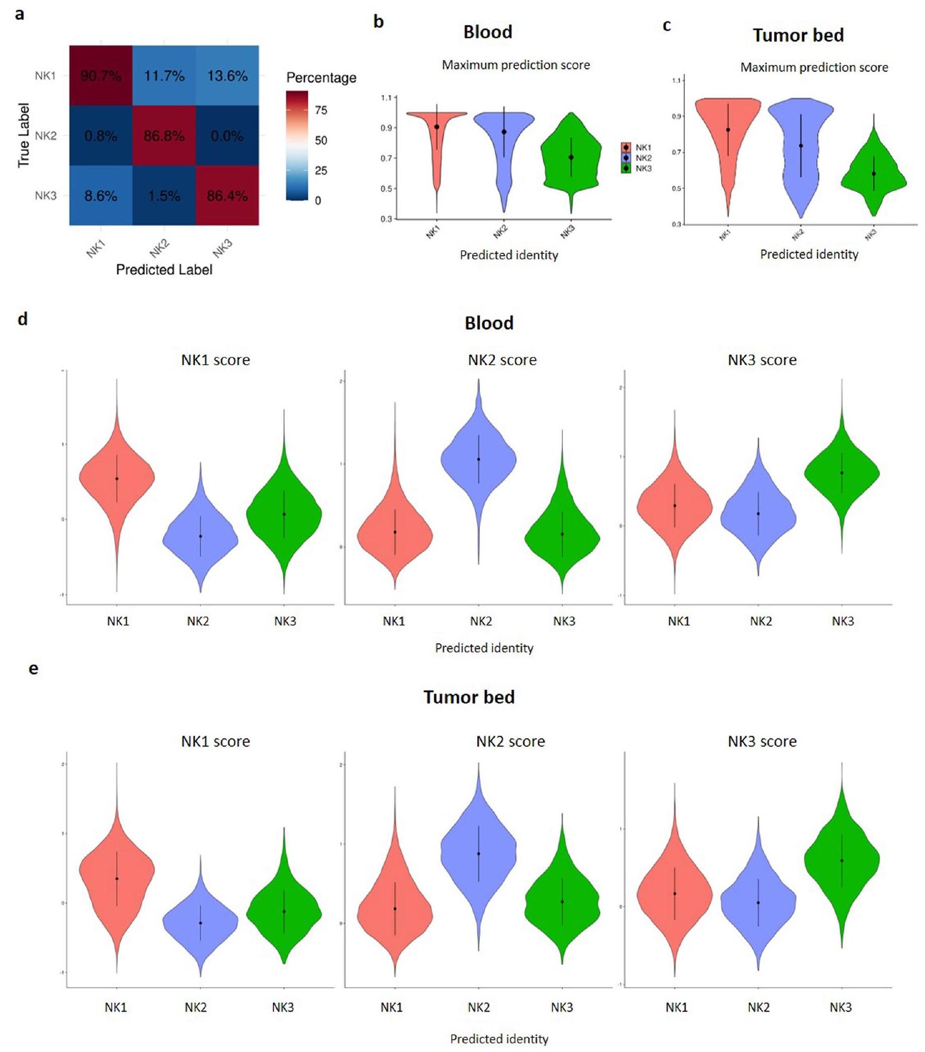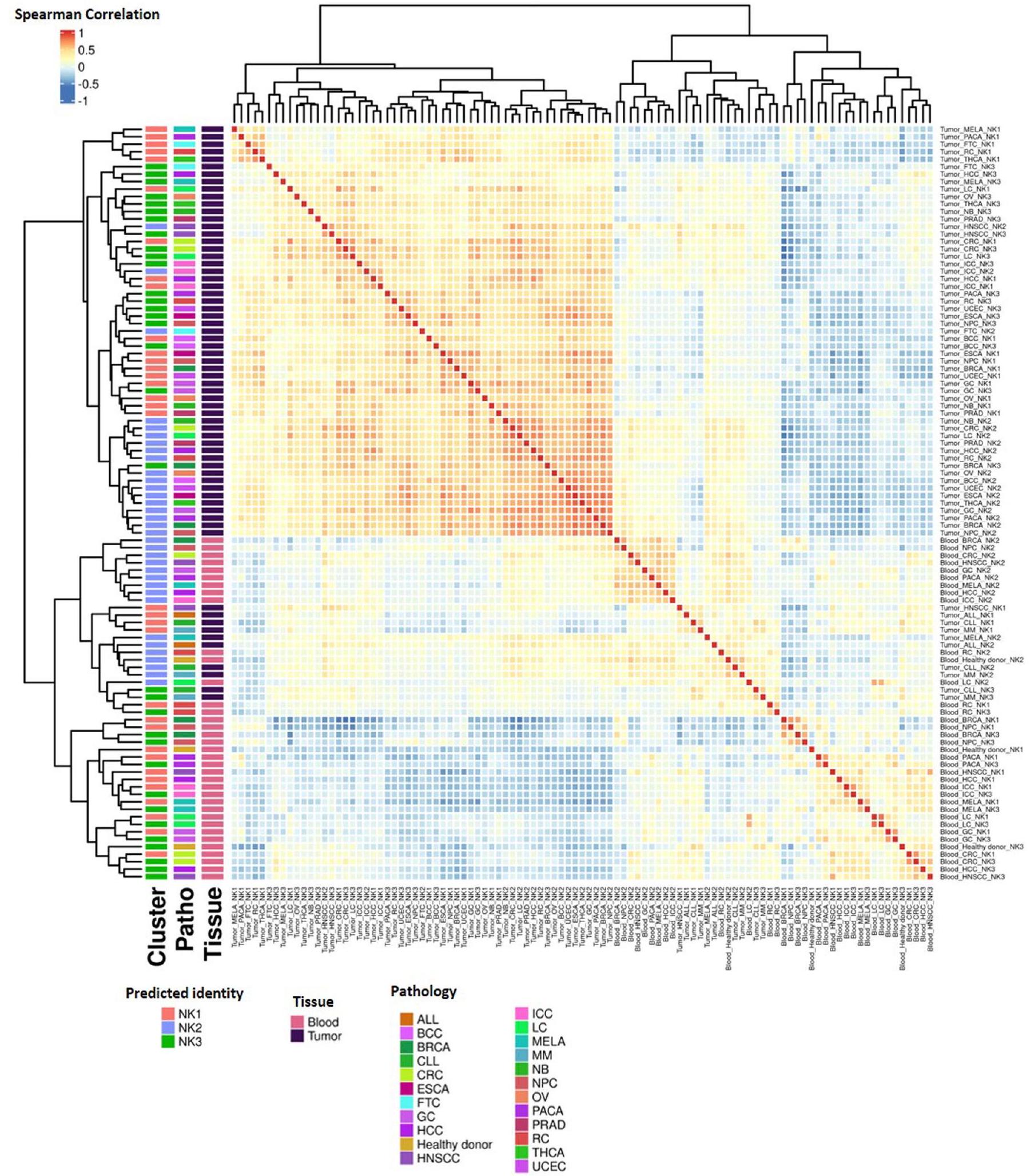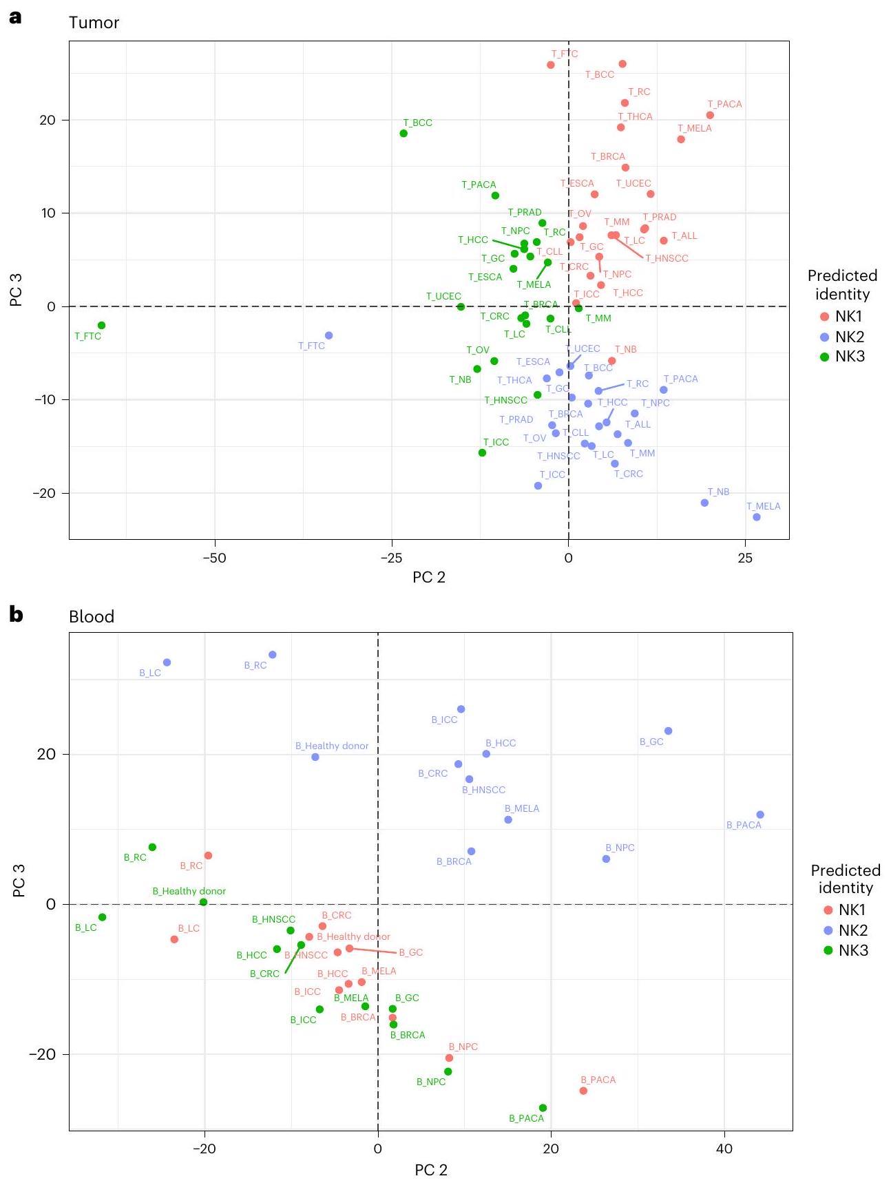 لا يتوافق مع ما تم العثور عليه في الدم (الشكل 7a، اللوحة السفلية). تم تأكيد هذا الاختلاف بين خلايا NK المتداولة وخلايا NK المرتبطة بالورم من خلال تحليل المكونات الرئيسية (PCA) (الشكل 7b، PC1)، كما تم تأكيد دقة توضيح NK1 و NK2 و NK3 في سرير الورم (الشكل 8a، b، PC2 و PC3). تم تأكيد الانحراف بين NK2 والمجموعات الفرعية الأخرى أيضًا في الدم من الأشخاص المصابين بالسرطان، لكن تأثير الورم على التمييز بين مجموعات NK1 و NK2 و NK3 أقوى في سرير الورم مقارنة بالدم (الشكل 8a، b). أكدت علاقة سبيرمان المحسوبة عبر مجموعات NK، نوع السرطان والأنسجة وتجمعها الهرمي غير المراقب أن خلايا NK تنفصل أولاً حسب نوع الأنسجة ثم حسب المجموعة التي تنتمي إليها (بيانات موسعة الشكل 10a). يشير التجميع الأفضل لـ NK1s و NK2s و NK3s في سرير الورم مقارنة بالدم أيضًا إلى ظاهرة متفاقمة في ظروف الورم.