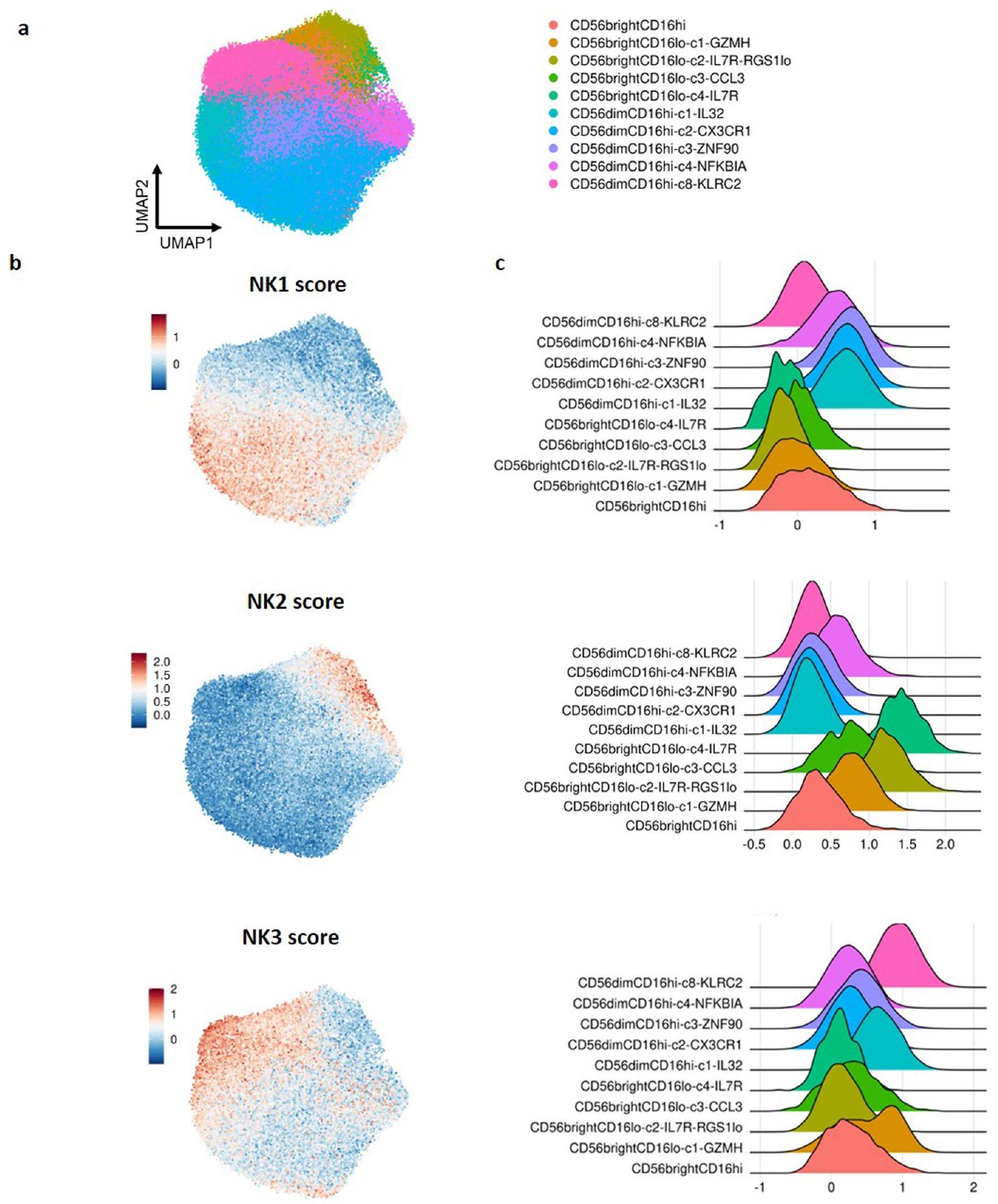 يمكن تقسيم مجموعة NK1 بشكل موثوق إلى ثلاث مجموعات فرعية، تُسمى NK1A وNK1B وNK1C؛ كما تم وصف مجموعة NKint ذات النمط الظاهري الوسيط بين NK1 وNK2. تماشيًا مع دراستنا الشاملة، حددت مجموعات بيانات scRNA-seq المنشورة مؤخرًا أيضًا عدة مجموعات فرعية. أظهرت المجموعة الفرعية NK1A أعلى مستويات التعبير لـ CXCR4 وJUN وJUNB، مما يعكس الوصف المنشور سابقًا لـ CD56 النشط. (مرجع 31) و CD56 الوسيط (المرجع 32) المجموعات. كان CD160 و IFITM1 الأكثر وفرة في مجموعة NK1B، وهي مجموعة تم التنبؤ بأن لديها أعلى استجابة للكيموكينات والسيتوكينات. أظهرت مجموعة NK1C أعلى مستويات التعبير عن PRF1 و PFN1 و ACTB و NKG7، بما يتماشى مع أوصاف CD56 الناضجة والنهائية. (مرجع 31)، CD56 المتأخر (مرجع 32)، العنقود 2 (مرجع 33) و CD56 CD57خلايا NK.