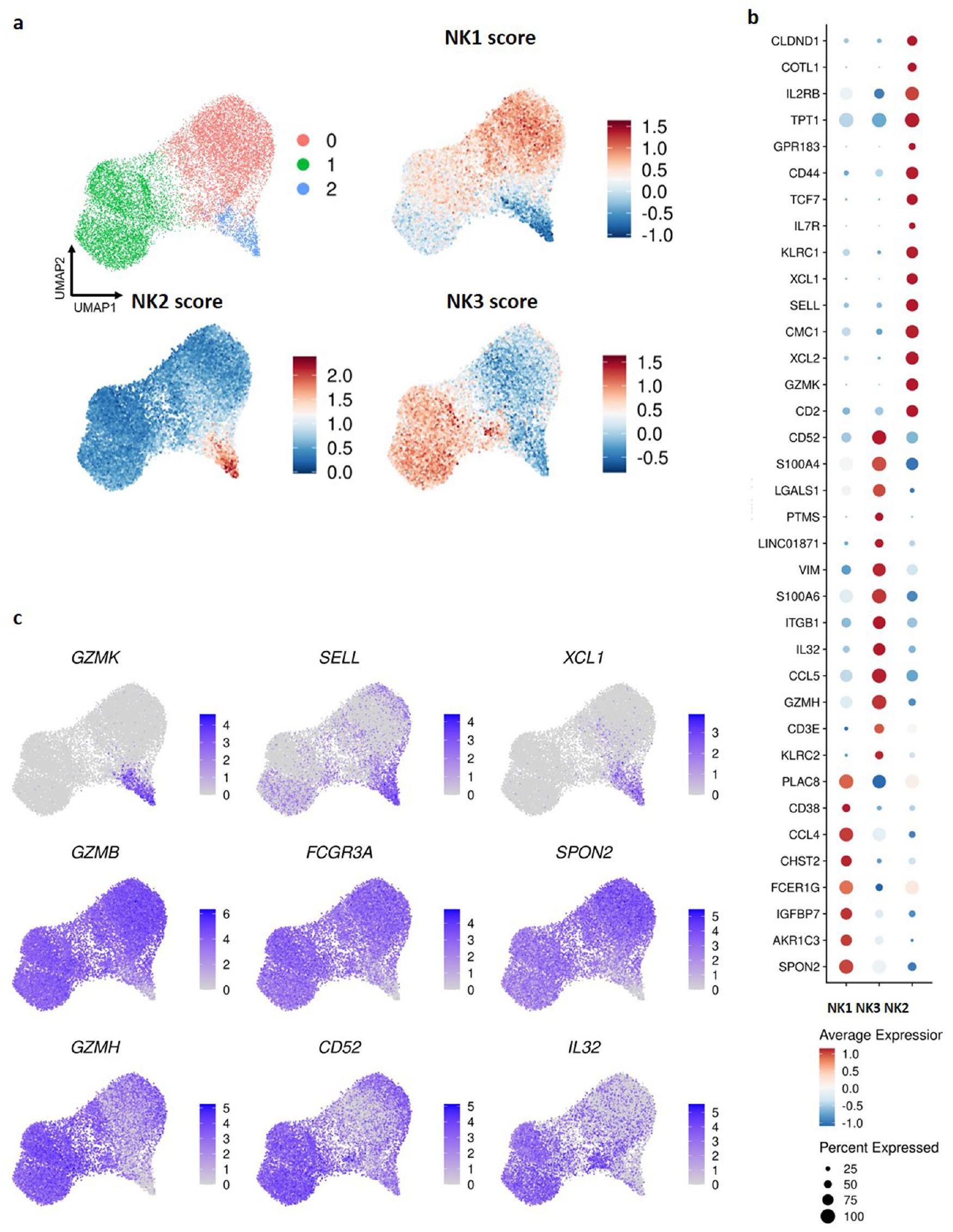 تحليل أهم 20 علامة تعريفية للمجموعات الست (الشكل 2هـ) قدم ملفًا تفصيليًا للتعبير الجيني لكل مجموعة. أظهرت خلايا NK1، كما هو ملاحظ في الشكل 1ب، توقيعًا أساسيًا يدل على الكيموكينات (CCL3 وCCL4) والبروتينات الحيوية للسُمية الخلوية وتنظيمها (PRF1 وGZMA وGZMB وNKG7) وديناميات الهيكل الخلوي (RAC2 وARPC2 وCFL1) والالتصاق الخلوي (ITGB2 وCALR). عبرت مجموعات NK1 الفرعية عن علامات محددة فريدة لكل مجموعة. تميزت NK1A بتعبير عالٍ عن CXCR4 وJUN وJUNB، التي تشفر AP-1
