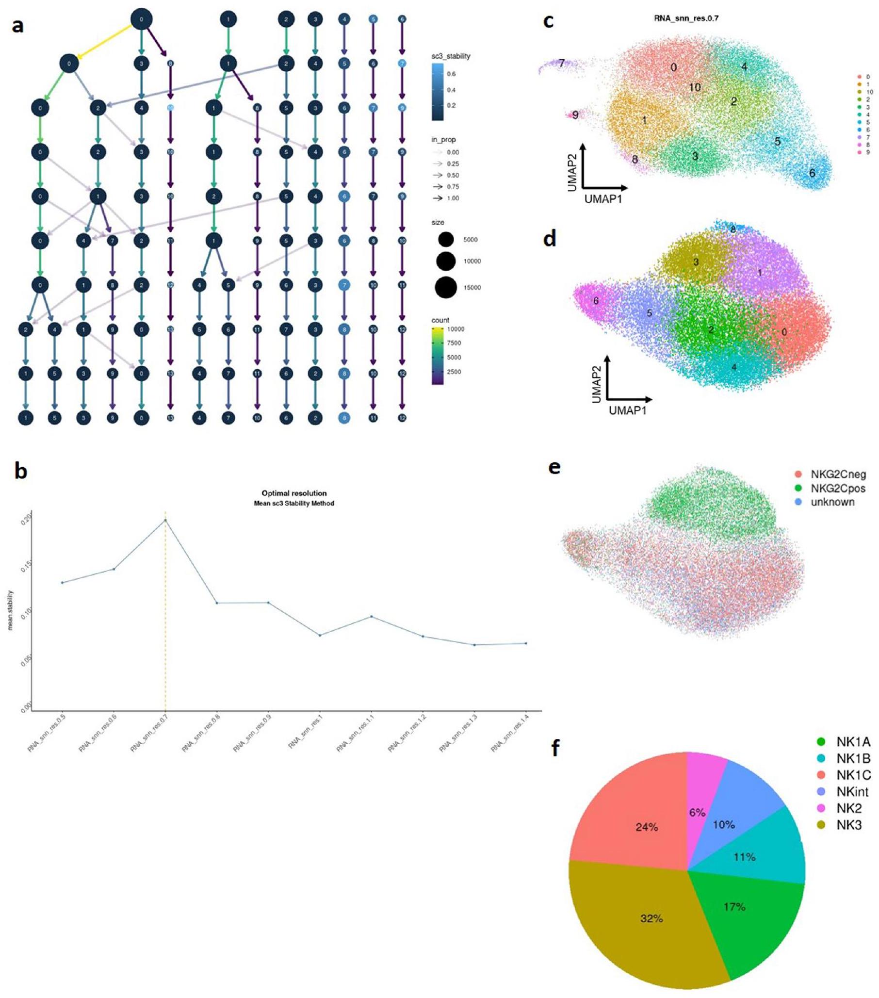 لقد كشفت الدراسة الشاملة لستة مجموعات فرعية من خلايا NK عن خصائصها المميزة من حيث العلامات، استجابة السيتوكينات والوظائف، بالإضافة إلى وجود استمرارية في المناظر النسخية لها، لا سيما بين مجموعتي NKint وNK1A. يبدو أن هذه الاستمرارية تربط بين الحالات النسخية لـ NKint وNK1C. للتحقيق في المسارات النسخية المحتملة التي تربط بين هذه المجموعات الفرعية، قمنا بإجراء تحليل متعدد الأبعاد.