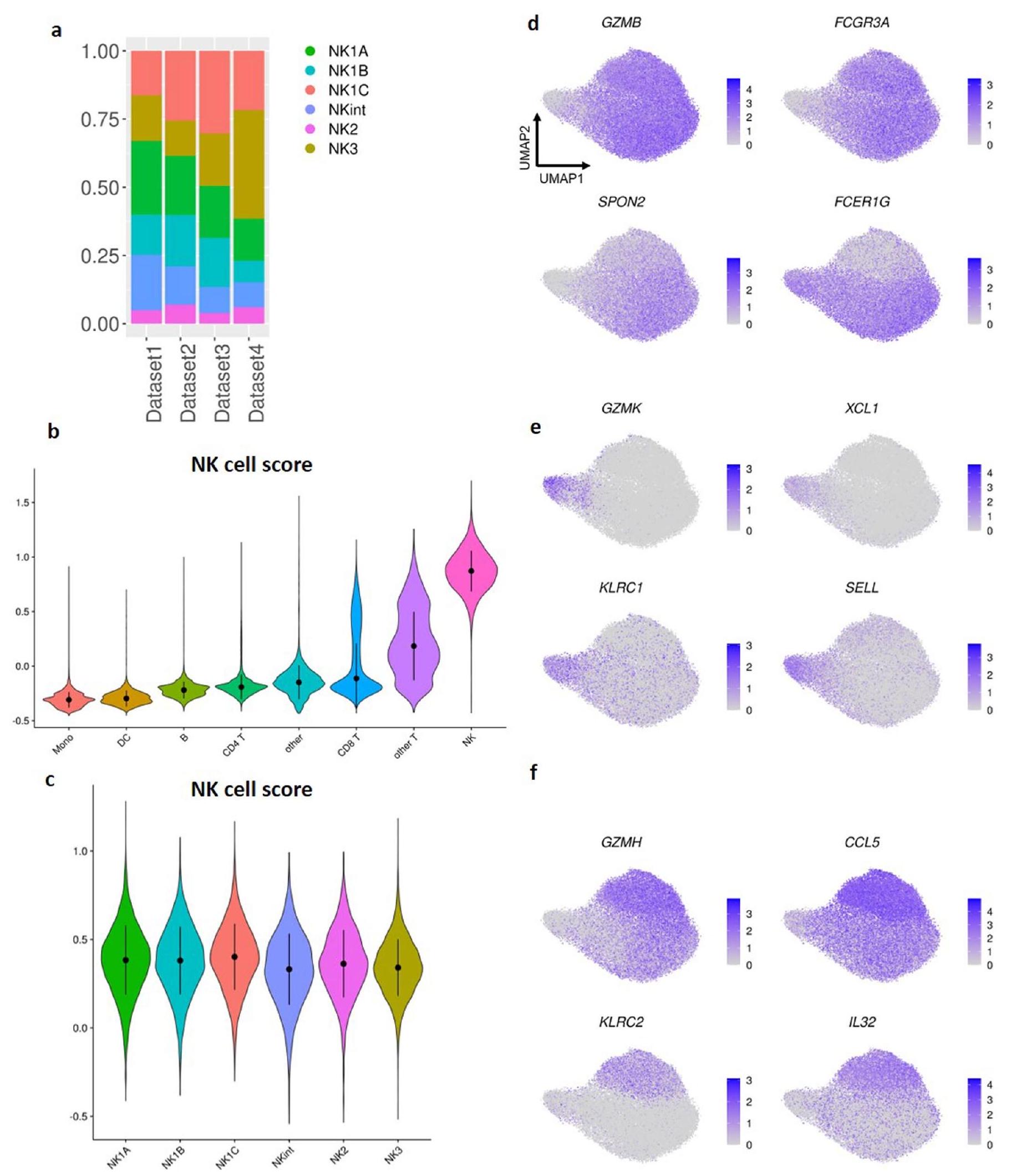 تظهر مجموعات NK2 وNKint، التي تشترك توقيعاتها الأساسية في جينات تشفر الكيموكينات (XCL1 وXCL2) والغرانزيمات (GZMK) والبروتينات المعنية في تنظيم النسخ والإشارات (NFKBIA وFOS وBTG1 وGAS5) وتخليق البروتين (TPT1 وعائلة جينات EEF) والبروتينات السطحية (CD44 وCD74 وCD7 وKLRC1)، أيضًا علامات مميزة. عبرت NK2