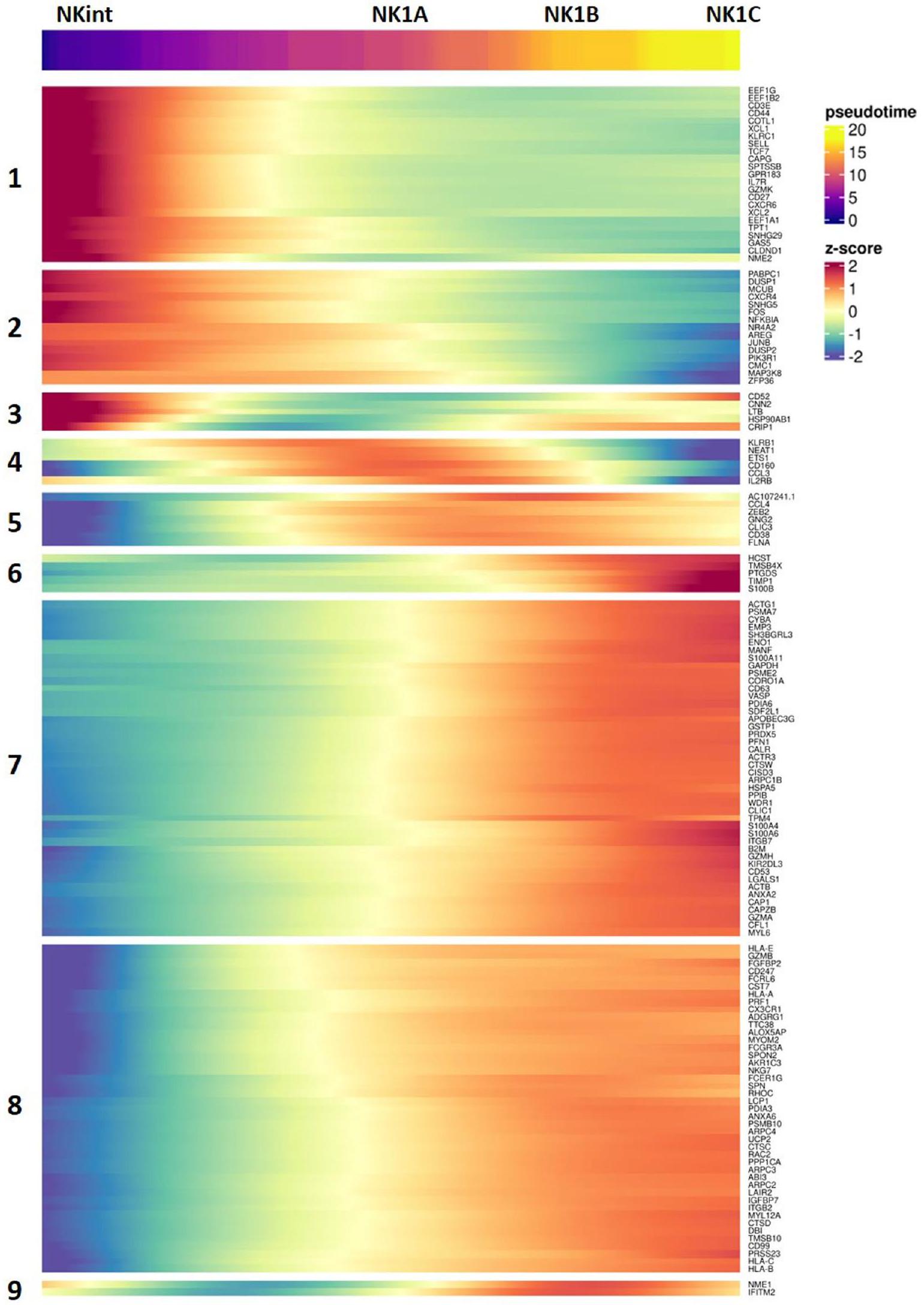 استنادًا إلى تحليل مونوكل، ركزنا على أفضل 150 جينًا أظهرت تغييرات ملحوظة على طول مسار نضوج خلايا NK من NKint إلى NK1C، كما هو موضح بواسطةقيمة أقل من 0.05 ودرجة ارتباط / موران عالية. كشفت هذه الدراسة التفصيلية عن تسعة وحدات جينية، تم تنشيط كل منها بشكل متسلسل مع تقدم الخلايا عبر مراحل النضج (الشكل التمديدي 6a).