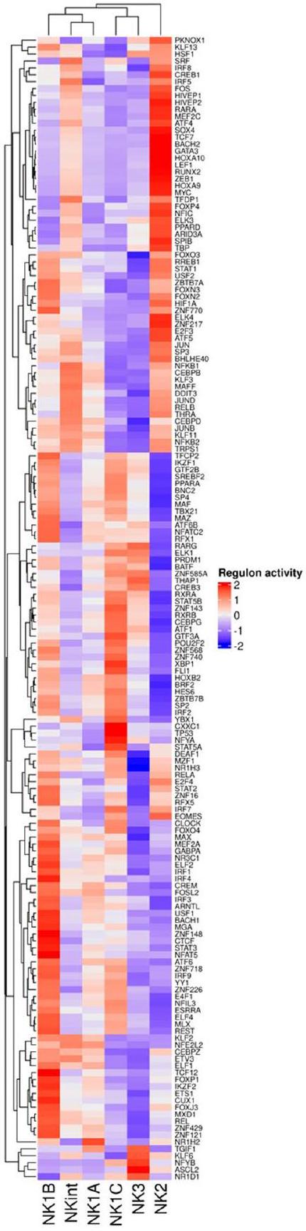الحمض النووي الريبي غير المحدد، والتركيز على تحليلنا فقط على عوامل النسخ الحقيقية. كشفت التجميع غير المراقب بناءً على نشاط التنظيم أولاً عن ميزتين بارزتين: أولاً، أن NK2 تفرعت بعيدًا عن المجموعات الفرعية الأخرى، مما يدعم نظرية أصل وجودي متميز لـ NK2. ثانيًا، قام التجميع أولاً بتجميع تحت المجموعات NKint وNK1A، مما يشير إلى أنهما قد تمثلان مراحل مبكرة من تمايز خلايا NK1، ثم جمع خلايا NK1B التي بدت أكثر تمايزًا، وأخيرًا شمل تحت المجموعات NK1C وNK3 التي تت correspond إلى حالات خلايا NK الأكثر تقدمًا.
