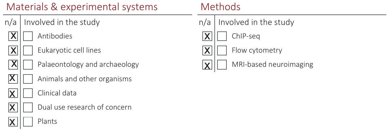 We require information from authors about some types of materials, experimental systems and methods used in many studies. Here, indicate whether each material, system or method listed is relevant to your study. If you are not sure if a list item applies to your research, read the appropriate section before selecting a response.