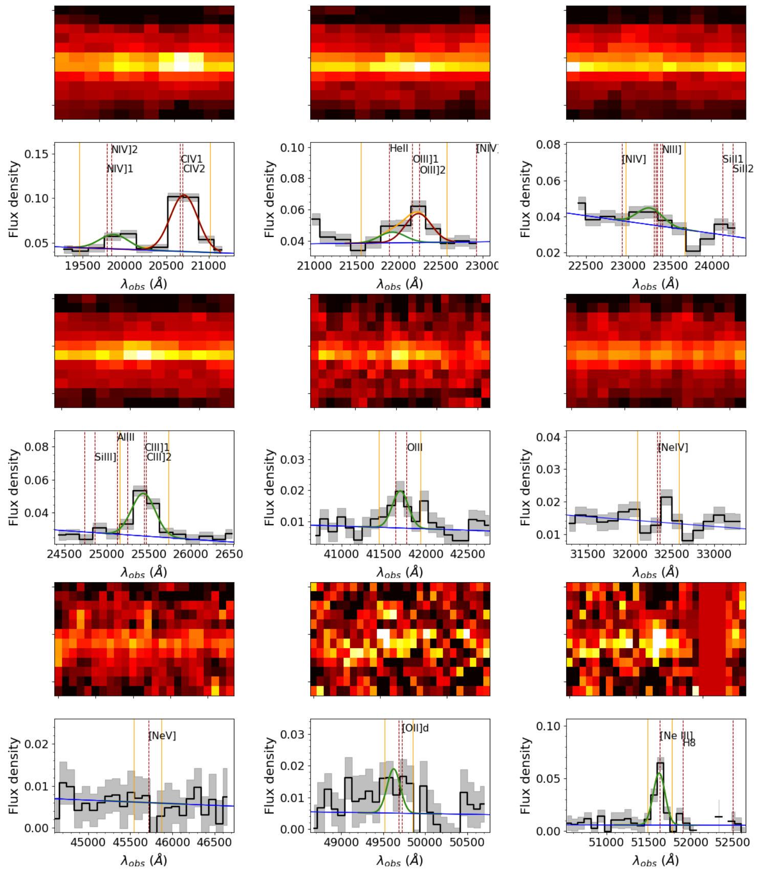 الشكل 2. من أعلى اليسار إلى أسفل اليمين: لقطات من طيف NIRSpec في مناطق بعرضإطار الراحة مركّز عند موقع C IV و N IV] ; هو II و O III]; N III] المؤقتةخط؛ ج III]; O III ، [ني IV] ; V ; [O II] و [Ne III]. جميع كثافات التدفق بوحدات تظهر المنطقة المظللة باللون الرمادي عدم اليقين في كل بكسل. تشير الخطوط الحمراء المتقطعة إلى الطول الموجي لجميع الميزات المحتملة في النطاق الطيفي المعني. تحدد الخطوط البرتقالية العمودية المنطقة التي يتم فيها تقييم نسبة الإشارة إلى الضوضاء (SNR) للميزة من التكامل المباشر. بالنسبة لجميع الخطوط المهمة، يتم عرض الملاءمة ذات الغاوس الواحد ذات الصلة باللون الأخضر. عندما تم استخدام ملاءمة ذات غاوس مزدوج، يتم عرض المكونين كمنحنيات خضراء وحمراء، ومجموع الاثنين باللون البرتقالي. تظهر الخط الأزرق في كل لوحة الاستمرارية فوق البنفسجية المقدرة.