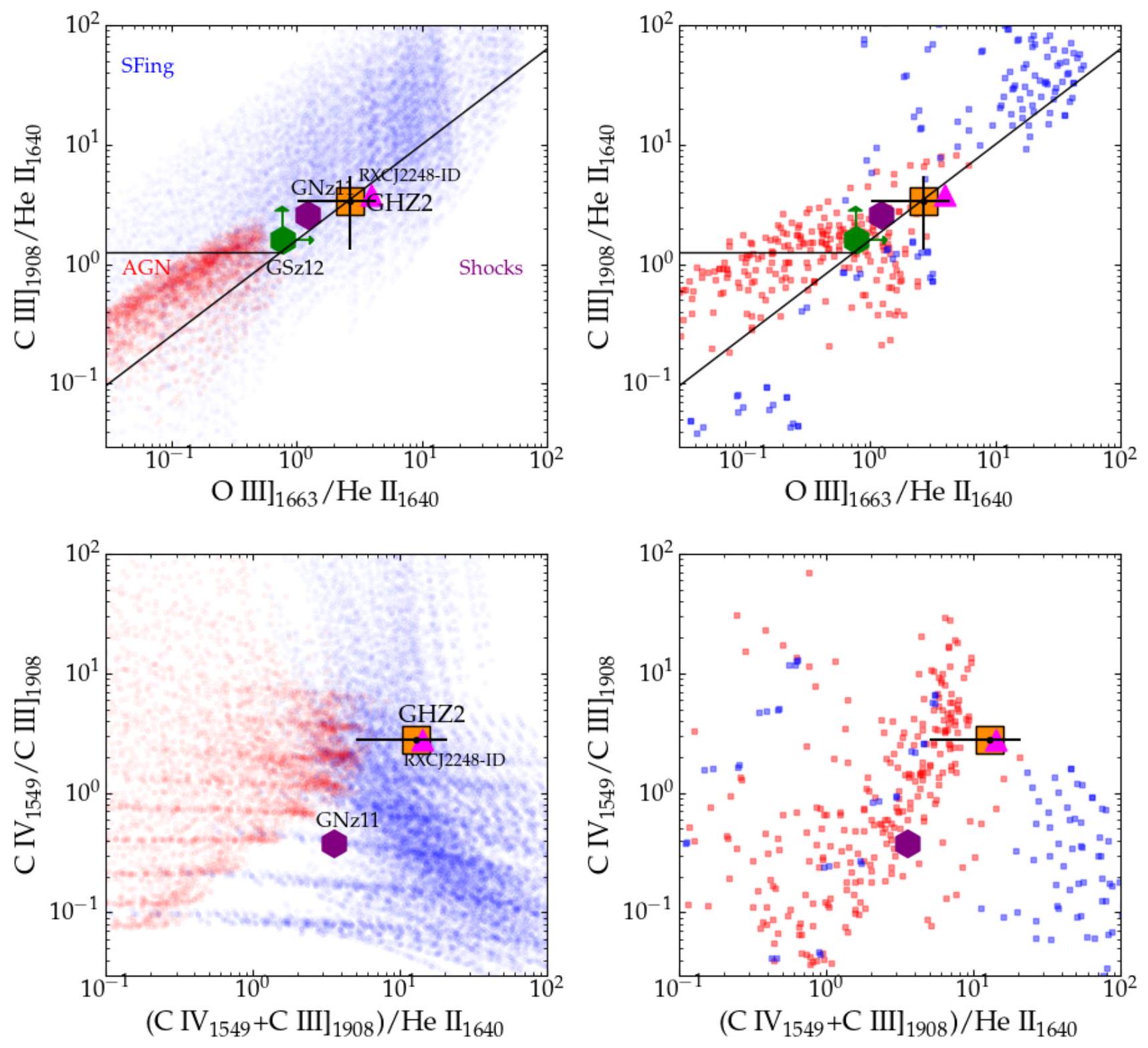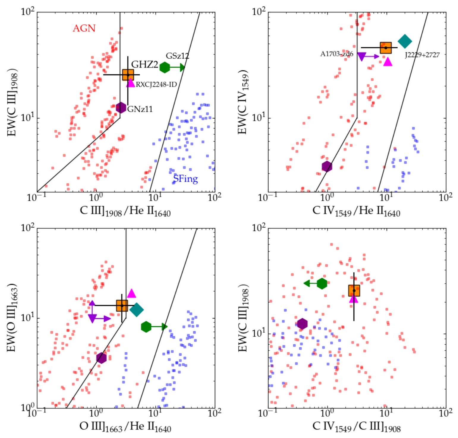 للمقارنة، نستغل مجموعة واسعة من نسب خطوط الانبعاث التي تم الإبلاغ عنها في الشكل 3. في جميع هذه الحالات، يقع GHZ2 عادةً في المنطقة التي تميل فيها نماذج تكوين النجوم ونماذج AGN إلى التداخل. ومن الجدير بالذكر أن التقييم يعتمد بشكل كبير على النموذج. GHZ2 أكثر توافقًا مع تكوين النجوم وفقًا لنماذج F16 و G16 في كل من مخططات C III]/He II مقابل O III]/He II و C IV/C III] مقابل (C IV + C III])/He II. بدلاً من ذلك، تمتد نماذج AGN من NM22 إلى المنطقة التي يوجد فيها GHZ2. كما أن موقع GHZ2 في مخطط C III]/He II مقابل O III]/He II متوافق أيضًا مع الانبعاث الناتج عن الصدمات وفقًا لمعايير الاختيار التي وضعها مينغوزي وآخرون (2023). تُظهر المقارنة مع أشياء أخرى ذات انزياح أحمر مرتفع مع خطوط انبعاث بارزة تشابهًا ملحوظًا بين GHZ2 و RXCJ2248-ID في جميع المخططات. GHZ2 قريب جدًا أيضًا من GNz11 في مخطط C III]/He II مقابل O III]/He II، بينما C IV الأضعف بكثير.الانبعاث في GNz11 يميز المصدرين في المخططات الأخرى. ربما يكون الاستمرارية المؤينة أضعف في GNz11، مما قد يساعد أيضًا في تفسير غياب خطوط الفلورسنت بوان في طيفه. نجد أنه في حالة نماذج F16/G16 و NM22، فإن نسب الخطوط المقاسة في GHZ2 هي نموذجية للمعادن المنخفضة. ) ومعامل تأين مرتفع في كل من حالة تشكيل النجوم وحالة AGN. في الواقع، يمكن تفسير الاختلافات بين مجموعتي النماذج على الأرجح من خلال نماذج NM22 التي تسمح بمعامل تأين مرتفع يصل إلى بينما تقتصر طائرات F16 و G16 علىاستنادًا إلى هذه المقارنات، ومع الأخذ في الاعتبار الفروق الكبيرة بين النماذج المختلفة، نستنتج أنه من الصعب تحديد مصدر الإشعاع المؤين بشكل قاطع استنادًا فقط إلى نسب الخطوط. نظهر في الشكل 4 المخططات التشخيصية المستندة إلى قيم عرض الخطوط (EWs) لخطوط الأشعة فوق البنفسجية المقترحة من قبل ناكاجيما وآخرين (2018) مقارنةً بنماذج NM22 (الوحيدة التي توفر معلومات عن EW). قيم EW في إطار الراحة لخطوط الأشعة فوق البنفسجية GHZ2 تتوافق دائمًا مع انبعاث AGN أو مع انبعاث مركب من كل من تكوين النجوم والاندماج. سيتم تصنيف GHZ2 كـ AGN وفقًا للحدود المقترحة من قبل ناكاجيما وآخرين (2018)، وكـ AGN أو مركب وفقًا لمعايير الاختيار من قبل هيرشمان وآخرين (2019). تظهر المصادر الأخرى لخط C IV توافقًا مشابهًا مع قيم EW ونسب الخطوط النموذجية لـ AGN؛ على وجه الخصوص، RXCJ2248-ID قريب بشكل ملحوظ من GHZ2 في جميع المخططات المعنية، مشابهًا لحالة تشخيصات نسب الخطوط التي تم مناقشتها أعلاه.