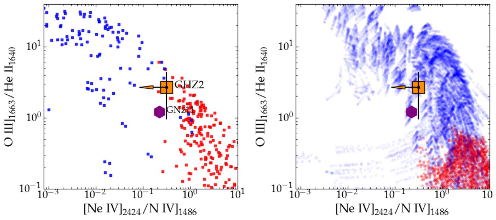 تشير خطوط الانبعاث البارزة المكتشفة في طيف GHZ2، بما في ذلك الانتقالات عالية التأين مثل C IV وN IV]، بوضوح إلى وجود مصدر تأين قوي. من أجل التمييز بين ما إذا كان مصدر التأين السائد في GHZ2 هو نجم نشط (AGN) أو انبعاث من تجمعات نجمية شابة، قمنا باختبار عدة تشخيصات تستغل النسب وEWs لخطوط الأشعة فوق البنفسجية (على سبيل المثال، Feltre et al. 2016؛ Nakajima et al. 2018؛ Hirschmann et al. 2019، 2023؛ Mingozzi et al. 2023). في ما يلي، نقارن GHZ2 بمجموعتين مختلفتين من النماذج التي تم بناؤها من خلال معالجة انبعاث النجوم أو AGN باستخدام كود التأين الضوئي CLOUDY (Ferland et al. 2013). نحن نعتبر نماذج للمجرات التي تشكل النجوم من قبل غوتكين وآخرون (2016، G16 فيما بعد) استنادًا إلى أحدث إصدار من نماذج تركيب السكان النجمي لبروزوال وشارلوت (2003) (انظر فيدال-غارسيا وآخرون 2017، للتفاصيل)، ونماذج AGN ذات الخطوط الضيقة من قبل فيلتري وآخرون (2016، F16 فيما بعد). نقارن أيضًا مع نماذج تشكيل النجوم من النوع الثاني (استنادًا إلى SEDs من BPASS v2.2.1، ستانووي وإلدريدج 2018) ونماذج AGN من قبل ناكاجيما ومايولينو (2022، NM22 فيما بعد). نشير إلى القارئ إلى الأوراق المذكورة أعلاه لوصف مفصل لإجراءات النمذجة والافتراضات. بينما تشمل النماذج المدروسة نطاقًا واسعًا من القيم لـ