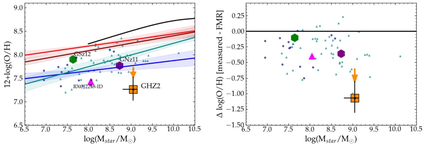 Figure 6. Left: the position of GHZ2 and other objects on the gas-metallicity versus stellar-mass plane (symbols as in Fig. 3) compared to the mass-metallicity relations at (black line; Curti et al. 2020), (light red), and (dark red) from Li et al. (2023), (cyan; Nakajima et al. 2023) and (blue; Curti et al. 2023a). The orange arrows indicate the upper limit on metallicity of for GHZ2, which is the highest among available estimates. Blue and cyan points indicate single sources at from Curti et al. (2023a) and Nakajima et al. (2023), respectively. The shaded regions enclose the scatter around the best-fit relations. Right: deviation from the fundamental metallicity relation by Curti et al. (2023a) as a function of stellar mass for GHZ2 and the other single sources with the same symbols as in the left panel.