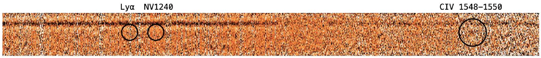 Figure 7. Top: the 2D X-SHOOTER spectrum of GHZ2 with highlighted the expected positions of Ly and N V , and the position of the detected C IV line. Bottom: the extracted 1D spectrum at the position of the C IV emission (blue dashed line). The red dotted line indicates the expected position of the C IV component.