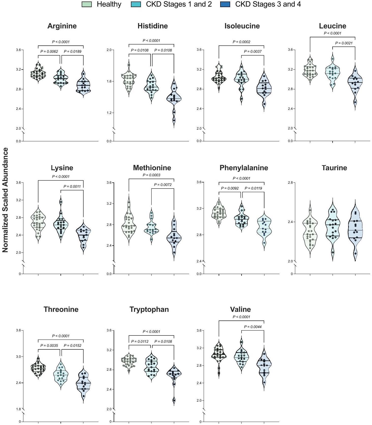 Decreases in five amino acids were identified in the serum of cats with early-stage CKD versus healthy cats (arginine, histidine, phenylalanine, threonine, tryptophan) (Fig. 3, Table 3). These amino acids were further decreased when comparing late-stage CKD to early-stage CKD cats, suggesting that there may be progressive changes occurring with disease advancement. In a previous investigation, serum phenylalanine, tryptophan, and threonine levels decreased proportionately with CKD stage