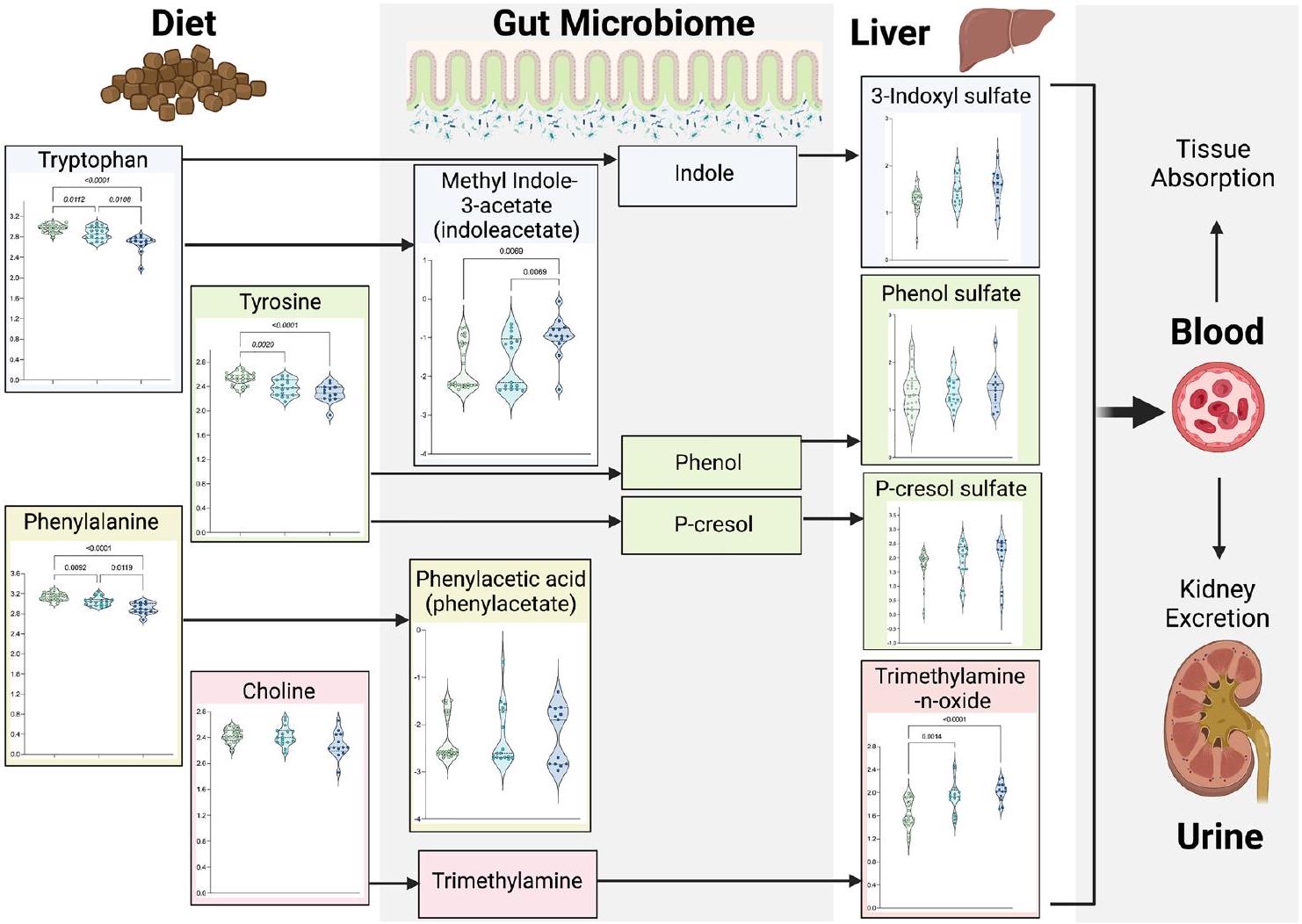 , versus the global-non-targeted approach herein using relative abundances normalized across a matrix of several hundred metabolites. However, in a non-targeted plasma metabolomics study conducted in purpose-bred research cats by Hall et al., indole-3-acetate abundances did not change in cats with CKD or in healthy cats following supplementation with eight weeks of daily dietary betaine and prebiotics, meant to modulate and decrease the production of gut microbiota-derived uremic toxins
