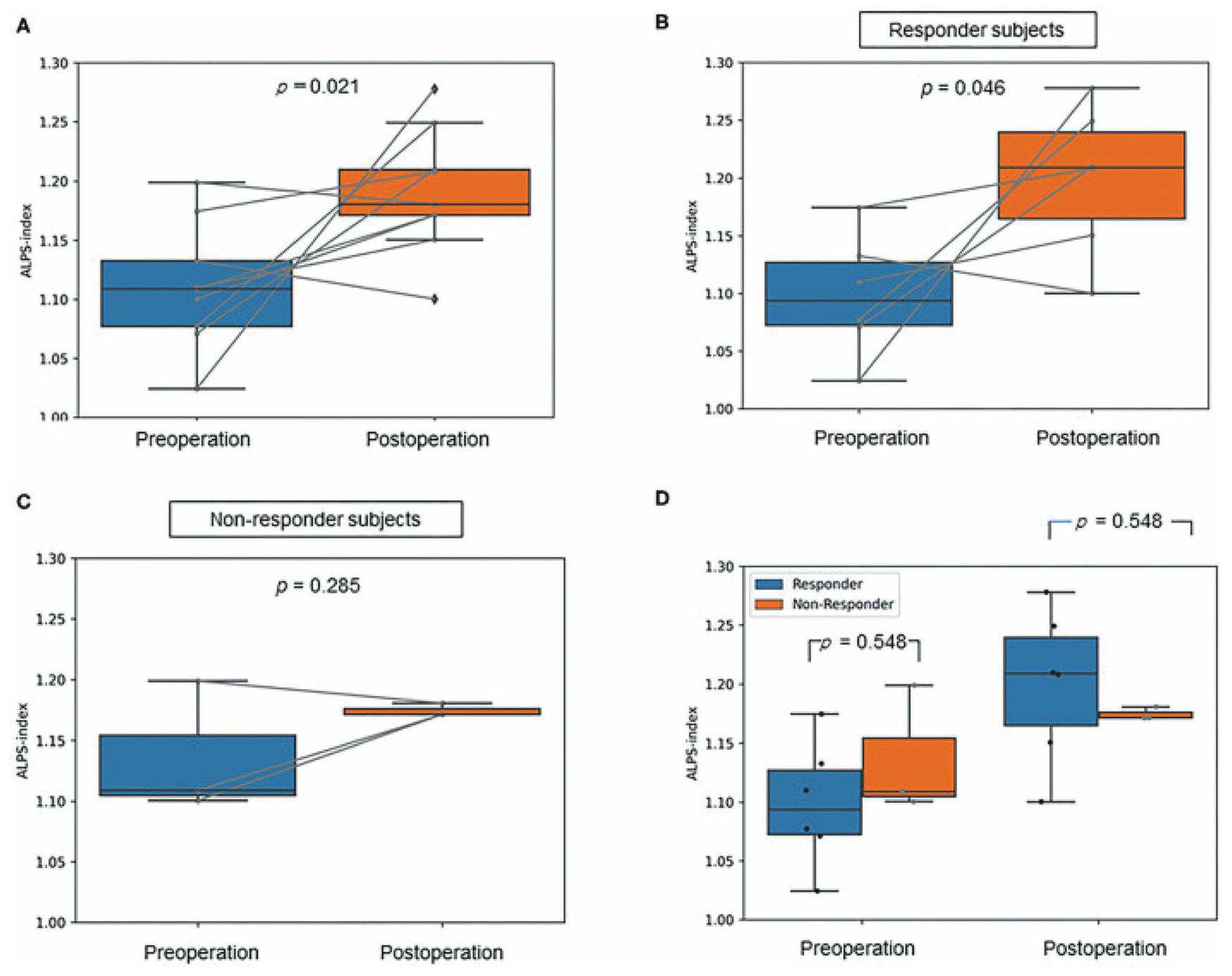symptomatic improvement after shunt surgery, whereas there was no significant increase in postoperative ALPSindex in the group without symptomatic improvement (Fig. 4).