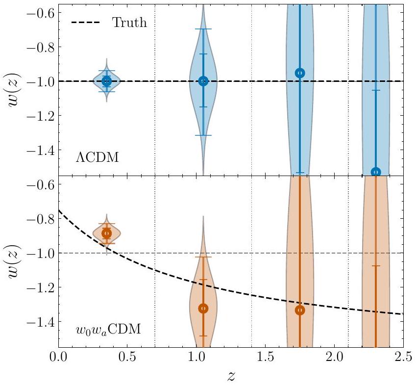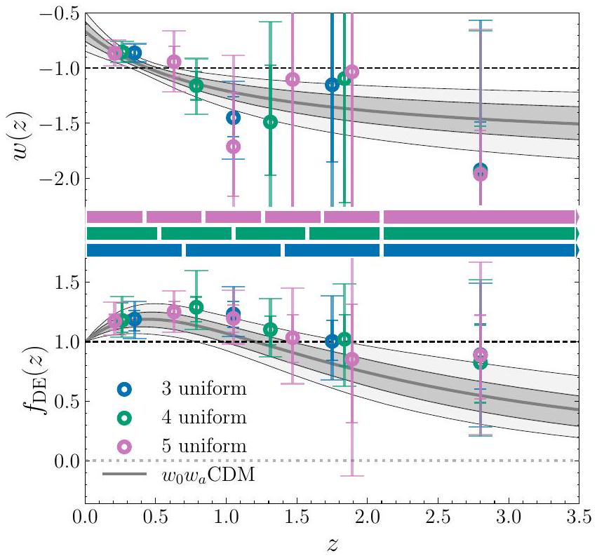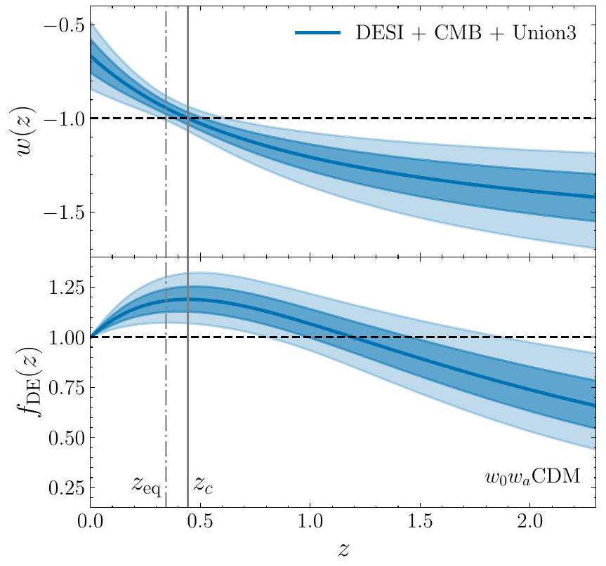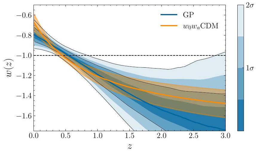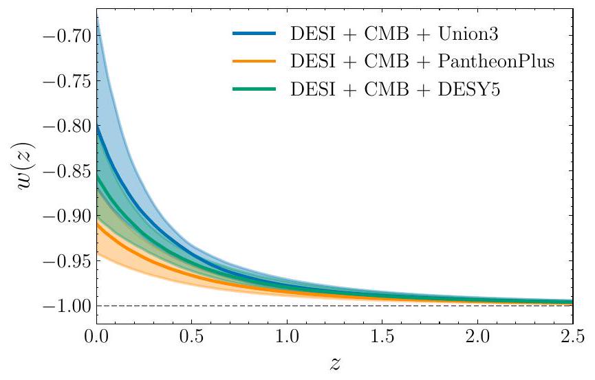 نبدأ بتلخيص النتائج الرئيسية للطاقة المظلمة من ورقة البحث الرئيسية BAO في DESI DR2 [47، مع افتراض أنالتمثيل المعطى في المعادلة (3). كمثال، القيود المهمشة في الـتظهر الطائرات في الشكل 1 لمجموعة بيانات DESI+CMB+Union3، مع القيود من بيانات DESI DR1 BAO مقارنة بتلك التي تم الحصول عليها من بيانات DESI DR2 BAO، والتي تت correspond إلى سنة واحدة وثلاث سنوات من البيانات، على التوالي. تفضل البيانات المجمعة المنطقة و بعيدًا عن الثابت الكوني، مما يعني أن معادلة الحالة كانت شبيهة بالخيالفي الماضي البعيد ومنذ ذلك الحين تطور إلىفي الوقت الحاضر، كما هو موضح في اللوحة العلوية من الشكل 2. تم ملاحظة هذا التفضيل في تحليلات DESI السابقة [40-44] ويستمر حتى عند السماح بتغيرات في الانحناء المكاني. [40، الجاذبية المعدلة 92، أو التعديلات على فيزياء ما قبل إعادة التركيب 93.