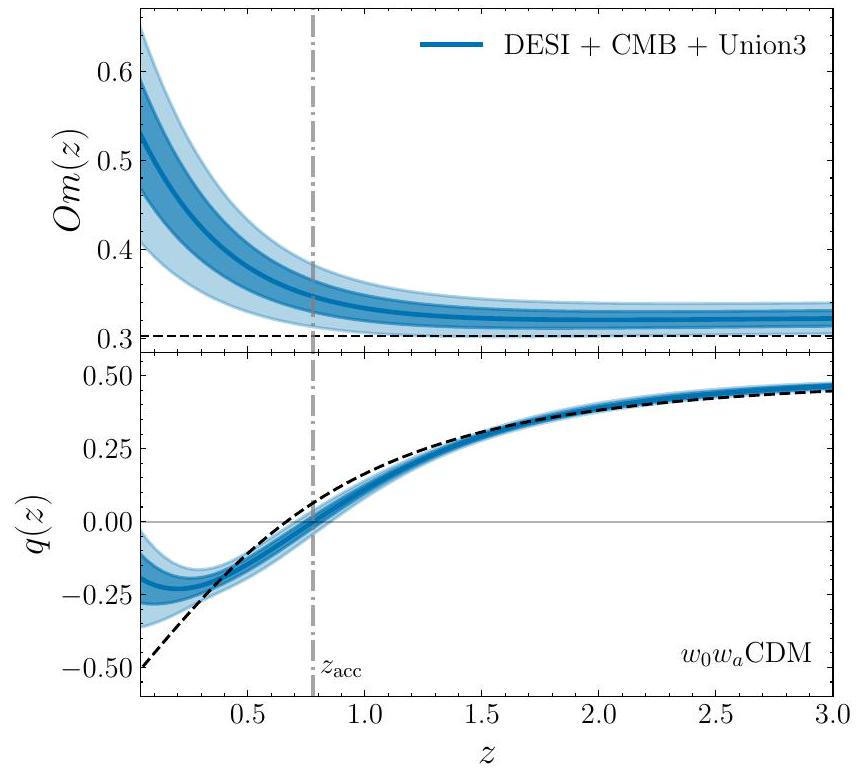 الشكل 3. تطور الـمعامل التشخيص والتباطؤ، كدالة من الانزياح الأحمر في النموذج. الخطوط الزرقاء الصلبة تتوافق مع الوسيط،، و مستويات الثقة المستمدة من مجموعة DESI + CMB + Union3. الخط المنقط الأسود يمثل أفضل ملاءمة لنفس مجموعة البيانات. الخط العمودي الرمادي يظهر الانزياح الأحمر ( ) الذي يتوافق مع بداية التسارع الكوني ( ).