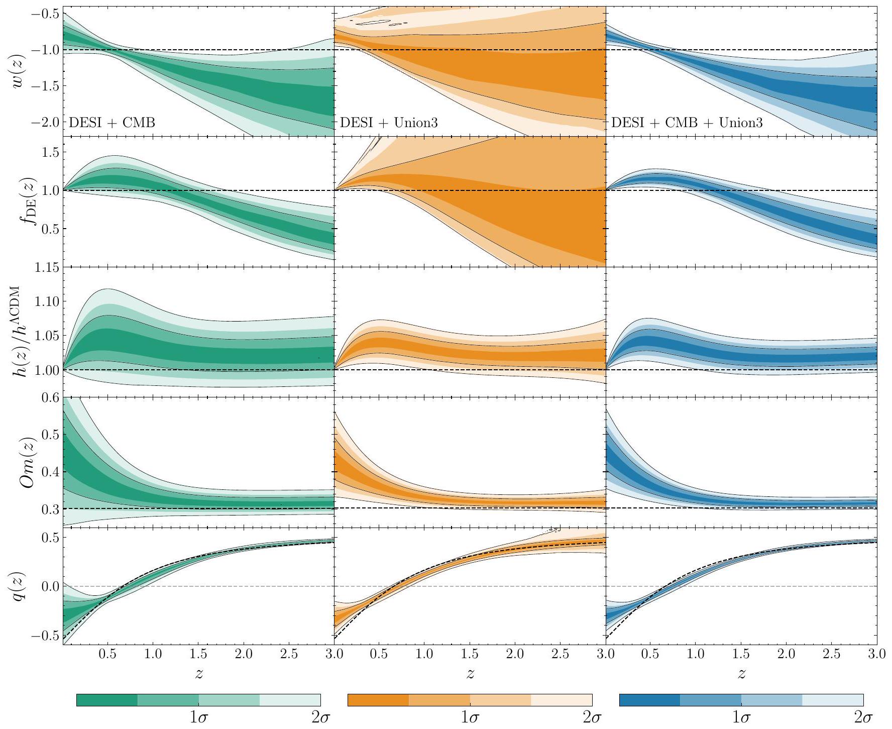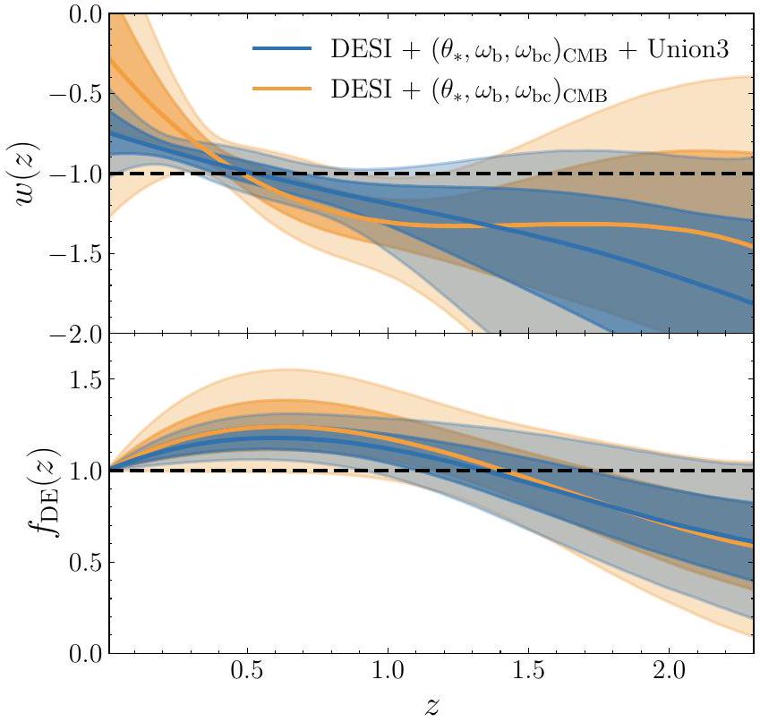 الشكل 5. إعادة بناء و باستخدام المعادلتين (11) و (12) معلـ DESIدمج البيانات، مع وبدون تضمين Union3. الخطوط الصلبة تتوافق مع الوسيط،، و مستويات الثقة حول ذلك. السلوك المعاد بناؤه الرئيسي لـ DE يتوافق بشكل ممتاز مع الأساليب المختلفة غير المعتمدة على نموذج التي تم استكشافها في هذه الورقة. هذا يؤكد أن الاتجاه ليس مدفوعًا باختيار المعلمات، ويضيف إلى قوةنتائج CDM المقدمة في الورقة الرئيسية [47]. الخط الأفقي المتقطع يمثل.