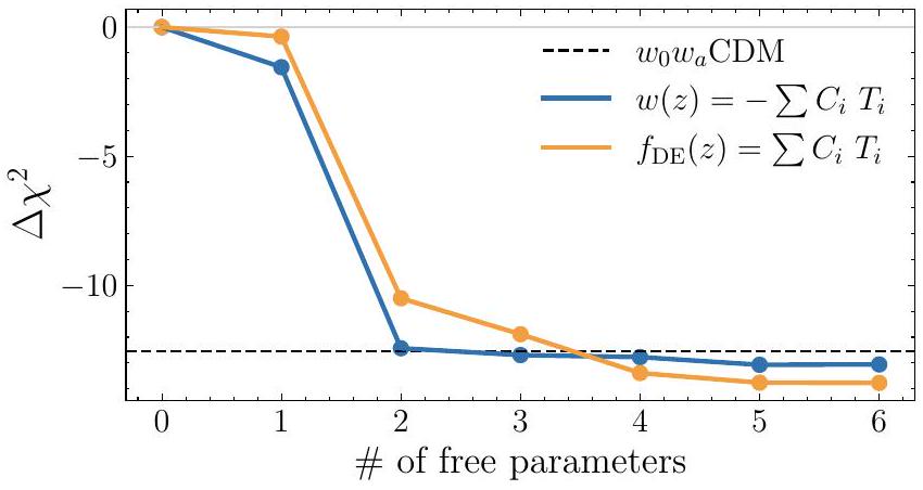الشكل 6. تحسين في الملاءمة بالنسبة لـ، كما تم قياسه بواسطة، كدالة لعدد المعلمات الحرة المدخلة في التوسع، لـ DESI +تركيبة الاتحاد 3.