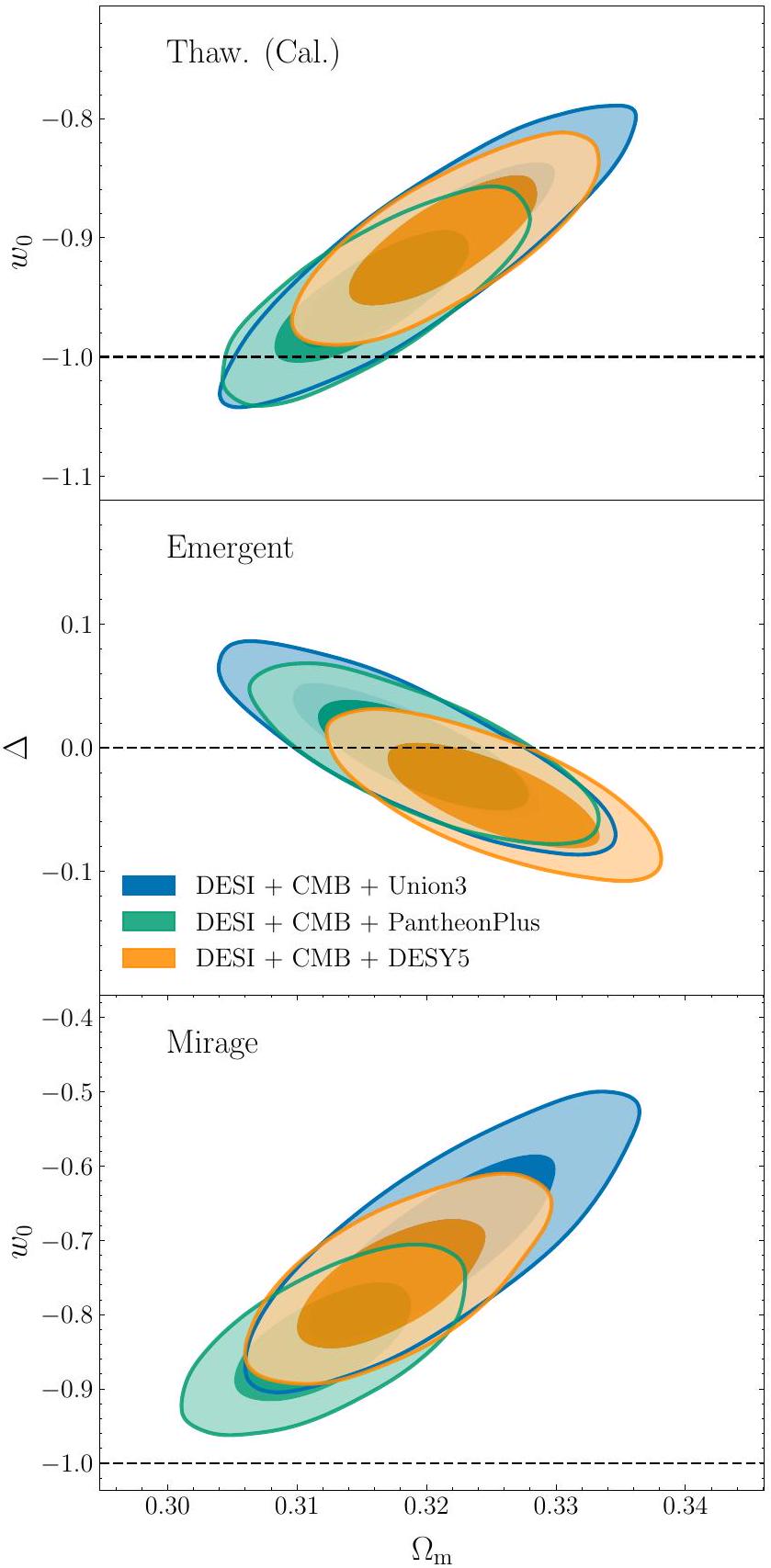 تظهر بيانات DESI DR2 BAO أن التوزيعات الخلفية المتوسطة قد تحولت قليلاً نحوالقيم المتوقعة لـ CDM، بينما زادت الشكوك المنخفضة بشكل طفيف من الأهمية الإحصائية للاختلافات منCDM إلى (مع تحسينات في الملاءمة تتراوح من )، مقارنة بـ من DR1 [40، 47]. تتبع استنتاجات مماثلة عند استخدام المتوسط المرجح لل posterior للاحتمالية اللوغاريتمية، النظير البايزي لـ. من أجل مقارنة النماذج البايزية المفصلة، انظر الملحق أ. من المثير للاهتمام، مع زيادة الدقة، أن بيانات DESI + CMB المجمعة تشير بالفعل إلىانحراف عنمستقل عن أي تجميع لـ SNe Ia، مع استنتاجات مماثلة مستخلصة من DESI+DESY3تركيبة، على الرغم من أنها تظهر توتراً أقل؛ انظر الشكل 14 في [47].