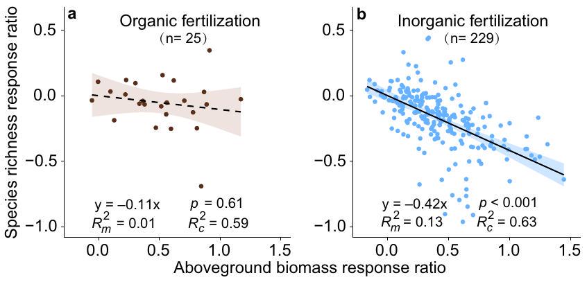 biomass production and SOC without a tradeoff in plant diversity loss. By comparison, increased aboveground biomass production and soil carbon storage resulted in plant diversity loss under inorganic fertilization. As such, organic fertilization is favored over inorganic fertilization to improve grassland ecosystem functions and services. Organic fertilization increased plant diversity in grasslands with greater soil moisture. Moreover, organic fertilization may improve the soil environment for plant growth, and thus would avoid plant diversity loss caused by soil acidification and ammonium toxicity that is usually found under inorganic fertilization. Therefore, we argue that increasing the use of organic fertilizers would provide an important naturebased solution to increase productivity and soil carbon sequestration while conserving plant diversity.