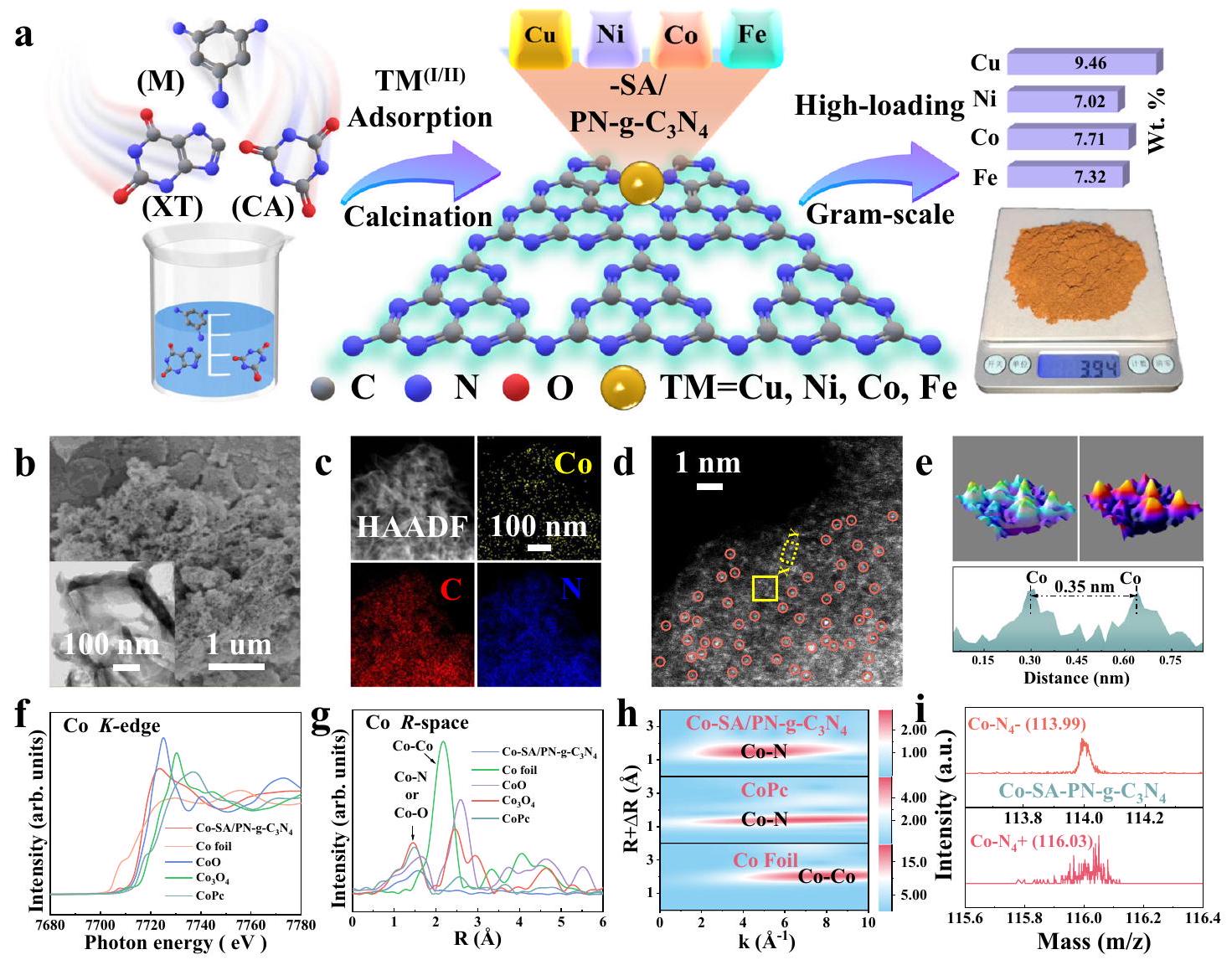 تم استخدام استراتيجية التحلل الحراري المدعوم بالروابط الهيدروجينية لتصنيع سلسلة من الكربون النيتري الغرافيتي الغني بالنيتروجين المدمج بمعادن انتقالية مفردة (TM-SA/PN-g-C3الخ catalysts. هذه الطريقة السهلة سمحت بالإنتاج على نطاق جرامي من TM-SACs مع تحميلات معدنية عالية (طرق إضافية وشكل 1a)تشير تحليلات طيف الانبعاث الذري باستخدام البلازما المقترنة بالحث (ICP-AES) إلى أن تحميل المعدن كان 9.46 و 7.02 و 7.71 ولـ“، و Fe، على التوالي (الشكل التوضيحي 1a). غياب القمم البلورية المميزة للمعادن في أنماط حيود الأشعة السينية (XRD) لمسحوق TM-SA/PN-g-C3 العيّنات (الشكل التوضيحي التكميلي 1ب) استبعدت وجود جزيئات بلورية كبيرة. وبالمثل، لم تكشف المجهر الإلكتروني الناقل عالي الدقة (HR-TEM) عن أي جزيئات نانوية مرئية (الشكل 1b والشكل التكميلي 2). تكشف صور المجهر الإلكتروني الماسح (SEM) أن TM-SA/PN-g- تتميز العينات بشكل مشابه من الرقائق المنحنية مع هيكل مسامي. الهيكل الرئيسي للمسامات المتوسطة دعم TM-SA/PN-g-C3.مع مساحات سطحية عالية كما هو موضح من خلال قياسات برونور-إيميت-تيلر (BET) (الشكل 1ب والأشكال التكميلية 3 و4). تؤكد صور خرائط التحليل الطيفي للطاقة المشتتة (EDS) التوزيعات المتجانسة لعناصر المعادن والكربون والنيتروجين عبر هذه الهياكل (الشكل 1ج والشكل التكميلية 5). ثم تم استخدام مجهر الإلكترون الناقل الماسح بتصحيح الشذوذ وزاوية عالية (AC HAADFSTEM) بدقة دون أنغستروم لتحديد تشتت أنواع المعادن.كما هو موضح في الشكل 1d والشكل التكميلي 6، تم توزيع ذرات المعادن الفردية عالية الكثافة، التي تمثل كنقاط ساطعة معزولة محددة بدوائر حمراء، بشكل موحد في TM-SA/ PN-g-عينات. يمكن تأكيد مثل هذه الملاحظات بشكل أكبر من خلال خرائط التوافق ثلاثي الأبعاد (3D) للخطوط المتساوية وتناسب دالة غاوسية متداخلة ذرية (الشكل 1e والشكل التكميلية 6). علاوة على ذلك، توزيع الشدة على طولفي يكشف عن المسافة الذرية لـ، وكانت SACs من الحديد تقريبًا0.35 و 0.35 نانومتر، على التوالي (الشكل 1d والشكل التوضيحي 6). بشكل عام، تؤكد هذه النتائج تحميل الذرات لـ، و Fe على TM-SA/PN-g-C3عينات بدون وجود هياكل بلورية مشتقة من المعادن.