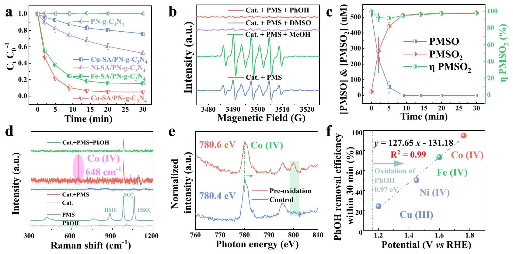 Fig. 2 | The pivotal role of for pollutant removal. a Comparison of pollutant removal efficiency between TM ( , and Fe )-SA/PN-g- . Error bars represent the standard deviation, obtained by repeating the experiment three times. EPR spectra of the different systems with DMPO as the spin-trapping agent. c PMSO probe experiment in Co-SA/PN-g-C system. Error bars represent the standard deviation, obtained by repeating the experiment two times. Reaction conditions in (a-c) [PMS] = Cat. , , initial , and . d In situ Raman study (the pink shade represents the signal of ). e Soft-XAS analyzes (the green shade represents the signal of ). Fitting of the relationship between the oxygen reduction potential of high-valent metals and the removal efficiency of PhOH within 30 min . Source data are provided as a Source Data file.