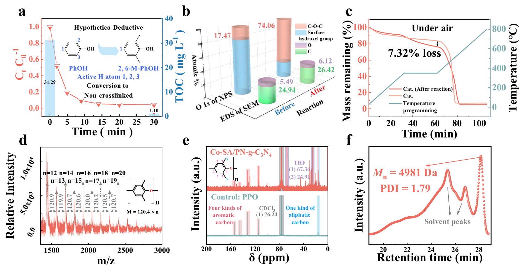 اختبارات مطيافية الكتلة بتقنية زمن الرحلة الأيونية (MALDI-TOF-MS) (الشكل التكميلي 37). ومع ذلك، تم أكسدة PhOH مع ثلاثة مواقع هيدروجين نشطة في هيكله الجزيئي (أي، مواضع ortho وpara لمجموعة الهيدروكسيل) بسهولة لتشكيل بوليمر متقاطع على شكل شبكة، والذي كان غير قابل للذوبان في المذيبات العضوية مثل ثلاثي هاليد الميثان (THMs)، والأسيتونيتريل (ACN)، والتتراهيدروفوران (THF) (الشكل التكميلي 37a). لذلك، تم اختيار 2،6-ثنائي ميثيل فينول (2،6-Mمع موقع نشط واحد فقط، والذي يميل إلى تشكيل منتج بوليمرة غير متقاطع، للتحقيق فيتفاعلات البوليمرة التي تم تحفيزها (الشكل 3a)، والتي تم دراستها من خلال عدة تحليلات بما في ذلك SEM-EDS وXPS وتحليل الوزن الحراري (TGA). كما هو موضح في الشكل 3b والشكل التكميلي 40، بعد اختفاءفي المحلول، لوحظ زيادة في عناصر C وO علىمن خلال SEM-EDS. تم التحقق من هذه النتيجة من خلال نتائج XPS O، التي أظهرت انتقالًا مميزًا في الأنواع السطحية O من مجموعة الهيدروكسيل إلى(الشكل 3b والأشكال التكملية 43a و44a). تكشف نتائج XPS C 1s بعد التفاعل أيضًا عن زيادة كبيرة فيوالروابط (الأشكال التكملية 45 و46). بالمقابل، لم تُلاحظ تغييرات كبيرة في طيف SEM-EDS أو XPS لركيزة PN-gقبل وبعد التفاعل (الأشكال التكملية 42 و46)، مما يدل على الدور الحاسم لمركز المعدن في بوليمرة الملوثات. أيضًا، تشير التغييرات الطفيفة في طيف XPS N 1s إلى أن بيئة التنسيق للذرة الواحدة ظلت مستقرة في التفاعل (الأشكال التكملية 43b و44b). تكشف هذه النتائج عن تراكم كبير للمنتجات العضوية على سطح المحفز. يمكن أن تتعرض هذه المنتجات للتفكك الحراري في عملية برمجة درجة الحرارة معفقدان الوزن مقارنةً بـكما كشفت تحليلات TGA (الشكل 3c والأشكال التكملية 47 و48). لفهم خصائص المنتجات المتكونة على سطح Co-SA/PN-g-C3، تم فصل المواد المودعة باستخدام مذيبات THF وتم تحليلها بواسطة MALDI-TOF-MS، والكروماتوغرافيا بالاستبعاد الهلامي (GPC)، والرنين المغناطيسي النووي (NMR)، وتحليل تحويل فورييه