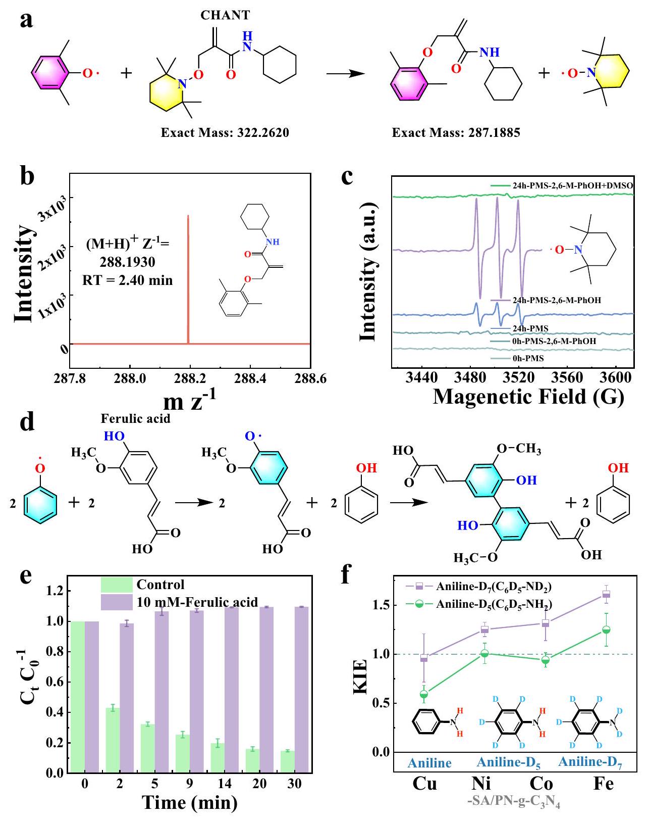 يتم استخدام الربط المتقاطع وحبس الدوران بشكل شائع لتثبيت الجذور الحرة العابرة في تحليل EPR (الشكل التكميلي 55 أ، ب). ومع ذلك، فإن هذه الطرق تعاني من نقص في المعلومات الهيكلية للجذور الحرة المحبوسة، وحساسية ضعيفة، وارتفاع حدوث إيجابيات زائفة بسبب التفاعلات الجانبيةلتجاوز هذه العيوب، قمنا بتطوير بروتوكول للكشف عن الجذور الحرة الفينوكسي باستخدام فخ الجذور الحرة الذي تم الإبلاغ عنه مؤخرًا، CHANT (الشكل التكميلي 56).. في مثل هذا البروتوكول، تم دمج الكروماتوغرافيا السائلة عالية الأداء مع مطيافية الكتلة المت tandem (UPLC-MS) مع تحليل EPR لتمكين الكشف الدقيق والموثوق (الشكل التكميلي 55c). كما هو موضح في الشكل 4a، أدى تفاعل جذر الفينوكسي مع CHANT إلى إنتاج منتج مستقر وغير جذري وأطلق الجذر المستمر TEMPO، الذي تم الكشف عنه بواسطة UPLC-MS معمن 288.1930 (الشكل 4ب) وتم استكشافه بواسطة EPR مع القمم الثلاثية النموذجية (الشكل 4ج)، على التوالي. عندما تم استخدام DMSO، وهو مادة مدمرة لـتمت إضافته، واختفى إشارة EPR للجذر المستمر TEMPO تمامًا (الشكل 4c). ثم، تم استخدام TEMPO، كعامل تقاطع تقليدي، أيضًا لالتقاط الجذور الفينوكسي. تظهر النتائج أن الجذور الفينوكسي يمكن أن تتفاعل مع TEMPO لتكوين مركب مستقر معمن 278.2075 (الشكل التوضيحي 59d). بالإضافة إلى ذلك، مستلهمًا من وظيفة FA المضادة للأكسدة في مجال الكيمياء النباتيةقمنا بتطوير FA كعامل لإزالة الجذور الحرة الفينوكسي لتحويل الجذور الحرة الفينوكسي مرة أخرى إلى سلف الفينول غير النشط من الناحية الحمراء (الشكل 4d). تظهر النتائج أن حوالي 10 مللي مول من FA قد منعت تمامًا إزالة PhOH في Co-SA/PN-g-C3.نظام PMS (الشكل 4e والشكل التكميلي 61). على الرغم من أن FA يمكن أن يتفاعل مع PMS مباشرة، إلا أن التنشيط الحفزي لـ PMS بواسطة Co-SA/PN-g-C3لا يزال يُلاحظ في وجود FA (الشكل التكميلي 61f)، مما يشير إلى الدور الحاسم لجذور الفينوكسي في تفاعل البوليمرة للملوثات. وبالتالي، تدعم هذه النتائج بقوةآلية تكوين الجذور الفينوكسي الناتجة عن التحفيز في عملية البلمرة لـ