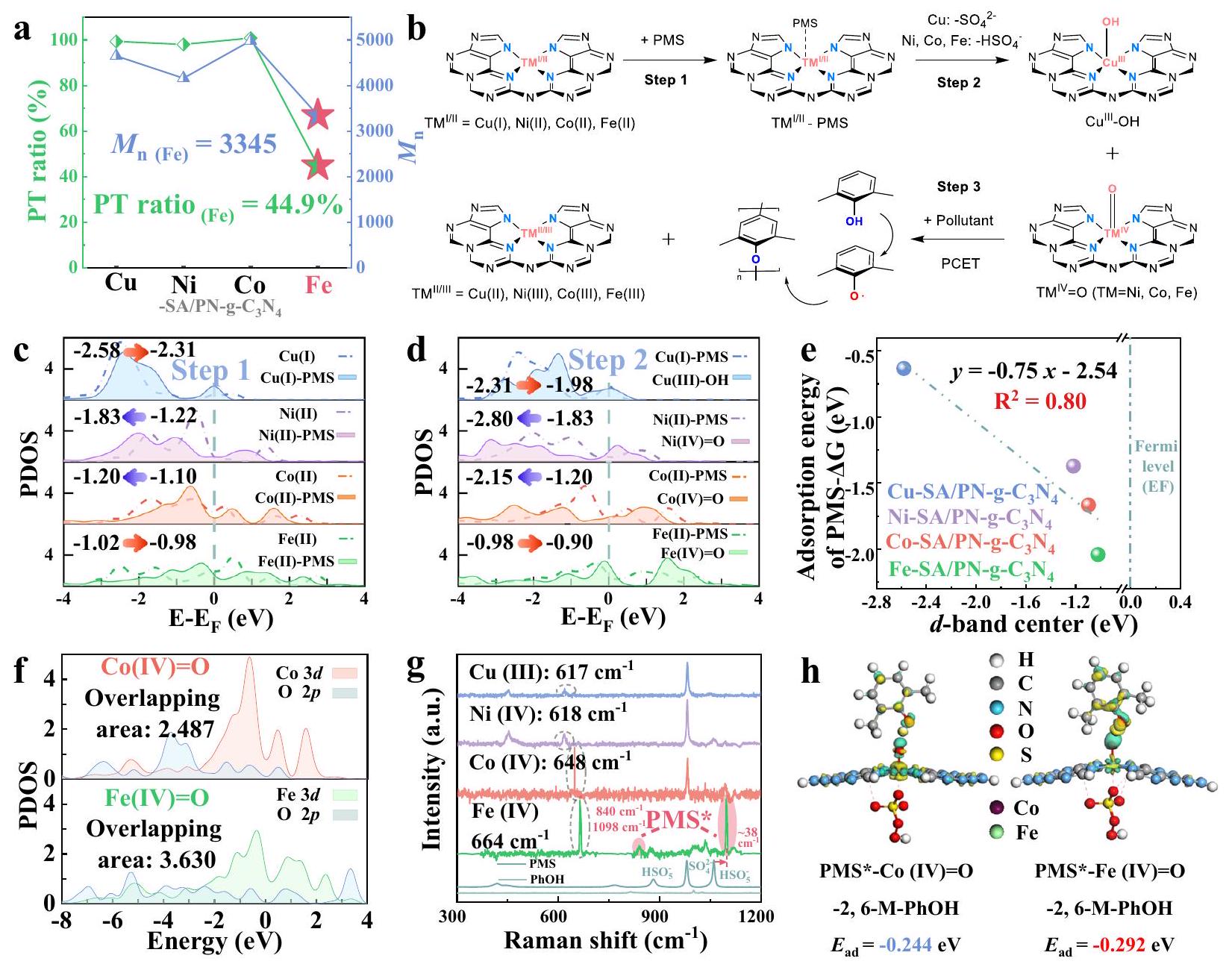 Fig. 5 | Depicting the roles of the -band center in oxidant and pollutant bindings. a The PT ratios and of the elution products in the four TM-SA/PN-g systems. Reaction conditions in , [Cat.] , initial , and . b Schematic diagram of phenoxyl radicals formation. PDOS of TM ( , and Fe ) in TM-SA/PN-g- systems of (c) step 1 and (d) step 2. e The relationship between the -band center and the adsorption energy of PMS. The PDOS of and TM (Fe and Co ) states on
