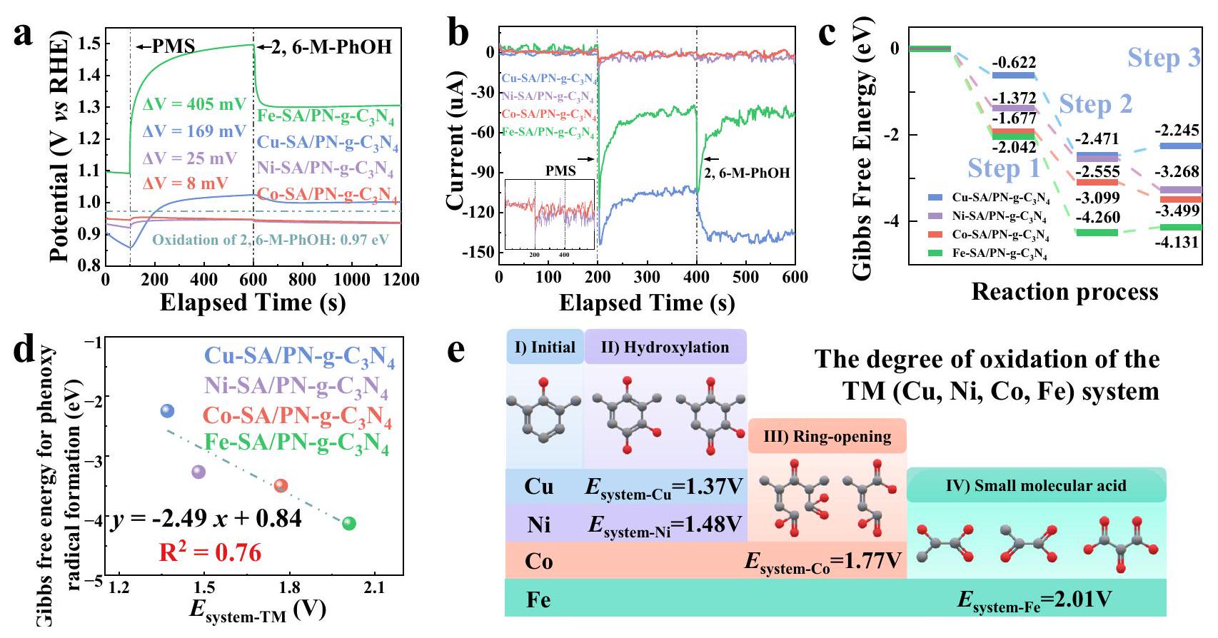 للتوليد الأكسيدي لجذور الفينوكسي (الخطوة 3)، لوحظ أن امتصاص سطح PMS كان له تأثير في إطالة رابطة O-O مع PMS، مما يعزز القدرة الأكسيدية لـ TM-SA/PN-g.أنظمة PMS عندما كانت المعادن عالية التكافؤ متورطة. أثرت الضغوط التأكسدية المختلفة بشكل كبير على السلوكيات اللاحقة لجذور الفينوكسي. لتأكيد هذا التغيير في القدرة التأكسدية بشكل تجريبي (بعد إنشاء نظام إدارة الطاقة (PMS*), تم إجراء قياسات جهد الدائرة المفتوحةكما هو موضح في الشكل 6a، تشير الزيادات الإيجابية في جهد الدائرة المفتوحة عند إدخال PMS إلى ارتفاع القدرة التأكسدية عبر جميع TM-SA/PN-g الأربعة.أنظمة PMS. تم ترتيب زيادات الجهد بترتيب تنازلي من حيث سعتها كالتالي:. يبدو أن الحديد (Fe) هو الأعلى-مركز النطاق وأعلى تقارب لـ PMS أظهروا الزيادة الأكثر أهمية في القدرة التأكسدية بعد تكوين PMS*الشكل 6 أ والشكل التكميلية 75). القدرة المرتفعة على الأكسدة لـ Fe-SA/PN-g-C3تم التحقق من نظام PMS بعد تكوين معقد FePMS* من خلال مجموعة متنوعة من التوصيفات الكهروكيميائية. أوضحت التحليلات الكرونوأمبيرومترية انخفاضًا سريعًا في اتجاهات التيار بعد حقن PMS، مما يشير إلى انتقال فوري للإلكترونات من PMS إلى المراكز المعدنية للمعادن الانتقالية (TM) (التي تتكون من، و الحديد ) في SA/PN-g- العوامل المساعدة، التي تعزز ولادة كيانات المعادن عالية التكافؤ (الشكل 6ب). من الجدير بالذكر أنه عندماتمت الإضافة لاحقًا، وانخفضت الاستجابة الحالية في البداية، لكنها زادت تدريجيًا لـ Fe-SA/PN-g-C3.بينما كانت تظهر فقط اتجاهًا هبوطيًا لـ (الشكل 6ب). كانت هذه الفروق الواضحة شهادة على القدرة التأكسدية القوية لمركب Fe-PMS*، الذي يمكنه استخراج