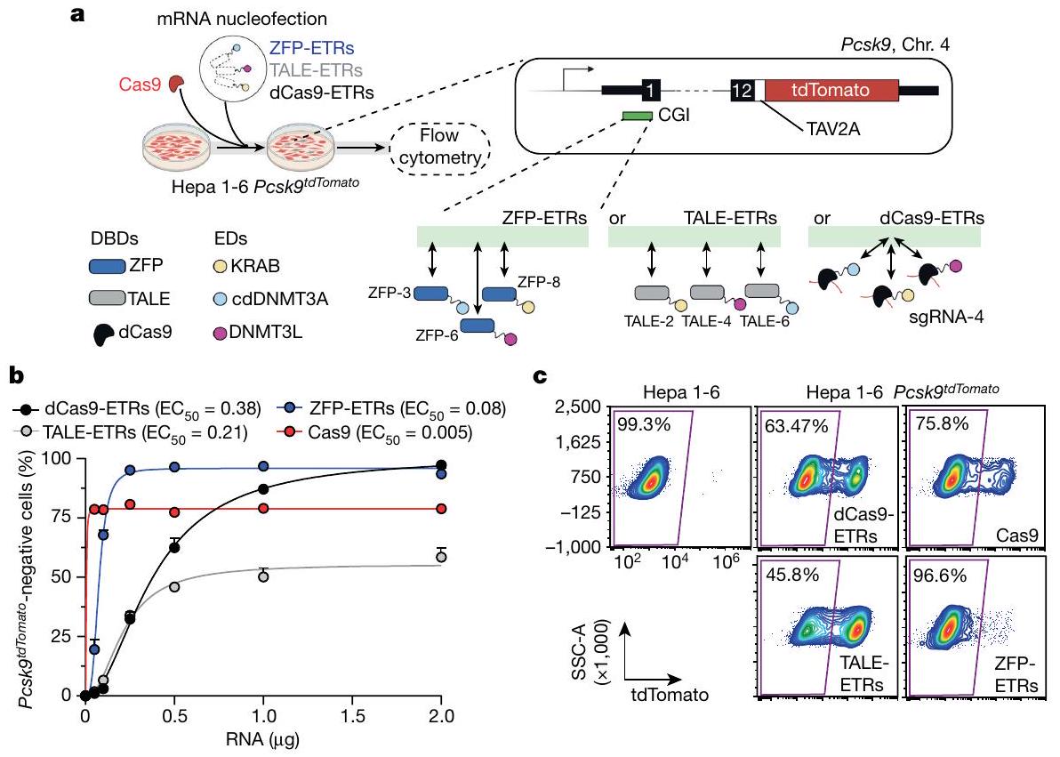 مواقع الأهداف الجينومية. ترتبط ETRs المعتمدة على dCas9 بنفس موقع الهدف، الذي تحدده sgRNA-4. أسفل اليسار، مفتاح للرموز المستخدمة في الرسم البياني في أعلى اليسار. تم إنشاؤه باستخدام BioRender.com. ب، تحليل الرسم النقطي الذي يظهر نسبة Pcsk-الخلايا السلبية في اليوم الثالث عشر بعد إعطاء جرعات تصاعدية من mRNAs التي تشفر لـ dCas9- و TALE- و ZFP- المعتمدة على ETRs، و Cas9. البيانات هي متوسطس.د.تركيز الفعالية نصف الأقصى ) لكل منصة تحرير يتم الإشارة إليها، كما تم حسابه من خلال ملاءمة نموذج لوجستي بأربعة معلمات ( لجميع العلاجات). ج، مخططات نقاط تدفق تمثيلية لخلية هيبا 1-6 وخلية هيبا 1-6 Pcskالخلايا، حيث تم تحليل الأخيرة في اليوم 29 بعد نقل RNA للنماذج المحددة. البيانات مأخوذة من الشكل الممتد 1g. SSC-A، منطقة التشتت الجانبي. مستقبل (LDL) على الغشاء البلازمي للخلايا الكبدية في الكبد. لهذا السبب، فإن تعطيل الـالجين ومنتجه قيد التحقيق المكثف لعلاج فرط كوليسترول الدم الوراثي والمكتسب.