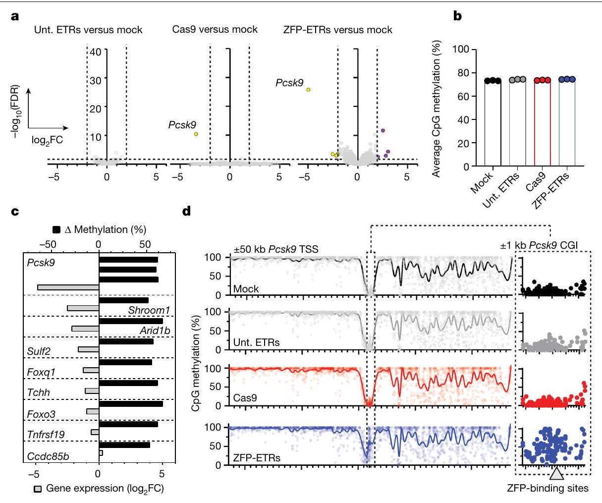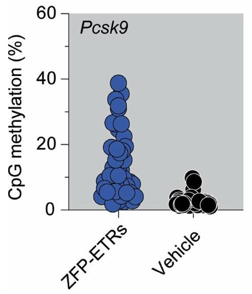 تحليلات WGMS (لكل حالة تجريبية). ج، رسم بياني عمودي يوضح العلاقة بين الميثلة التفاضلية وتغير التعبير الجيني لمقارنة ZFP-ETRs مقابل الشاهد. كانت مناطق الميثلة التفاضلية مرتبطة بجين معين عندما تقع فينافذة حول نظام TSS الخاص بها. تم رسم الجينات التي لهاويمكن حساب FDR من تحليل التعبير التفاضلي. تشير القضبان السوداء إلى التباين في نسبة ميثلة CpG للـ DMRs المحددة. د، اليسار، رسم مانهاتن من WGMS في ب يظهر ملفات ميثلة CpG للعينات المحددة في أ.منطقة جينومية مركزة على نقطة بدء النسخ (TSS) لجين Pcks9. تشير النقاط الفردية إلى متوسط الميثيلation لكل CpG. تم تعريف الخطوط المتصلة كمنحنى انسيابي مع 100 عقدة. على اليمين، عرض مكبر لـالمنطقة المتمركزة حول Pcsk9CGI. المنطقة الجينومية التي تحتوي على مواقع ارتباط ZFP (3 و6 و8) موضحة في الرسم البياني كمستطيل رمادي. استهداف تسلسل eGFP (المشار إليه فيما بعد بـ ETRs غير المستهدفة). عند مقارنتها بالخلايا المعالجة بشكل وهمي، لم يكن هناك أي جينات معبر عنها بشكل مختلف في الخلايا التي تم علاجها بـ ETRs غير المستهدفة، في حين أظهرت كل من الخلايا المثبطة إبيجينيتكياً والخلايا المعطلة لـ Pcsk9 انخفاضاً كبيراً (حوالي 30 ضعفاً) في مستويات التعبير عن Pcsk9 (الشكل 2أ والشكل التمديدي 2ب). على النقيض من خلايا Pcsk9 المعطلة، التي لم يكن هناك أي جين آخر معبر عنه بشكل مختلف، أدى العلاج بـ ZFP-ETRs إلى عدم تنظيم ثمانية جينات إضافية (أربعة منها تم تثبيطها وأربعة تم تنشيطها؛ الجدول التكميلي 1)، على الرغم من أنها كانت بمقدار أقل من Pcsk9. لم يكن أي من هذه الجينات قريباً من Pcsk9، ولم يظهر أي من الجينات الأربعين المجاورة لـ Pcsk9 عدم تنظيم ترنسكريبتوني كبير (الشكل التمديدي 2ج)، مما يشير إلى أن التثبيط الإبيجينيتكي لم ينتشر إلى الجينات القريبة. بما يتماشى مع بيانات الترنسكريبتوم، كانت مستويات ميثيل CpG على مستوى الجينوم متشابهة إلى حد كبير بين العينات، مع دلتا ميثيل أقل منبين خلايا ETR- والخلايا المعالجة بالوهم (الشكل 2b والشكل الإضافي 2d). هذه القيم قابلة للمقارنة مع تلك التي تم الإبلاغ عنها سابقًا لمنصات الإيبي-سيلينغ المماثلة.. من حيث المناطق الميثيلية المختلفة (DMRs؛ دلتا ميثيلايشن )، ما وراء ، والتي احتوت على 3 منها، تم العثور على 18 DMR أخرى في خلايا ETR مقارنة بالخلايا المعالجة بالعلاج الوهمي (الجدول التكميلي 2). أظهر تقاطع التحليلات النسخية وتحليلات الميثيل DNA أن ثمانية من بين تسعة جينات مرتبطة بـ DMR كانت أيضًا منخفضة التعبير (الشكل 2c و