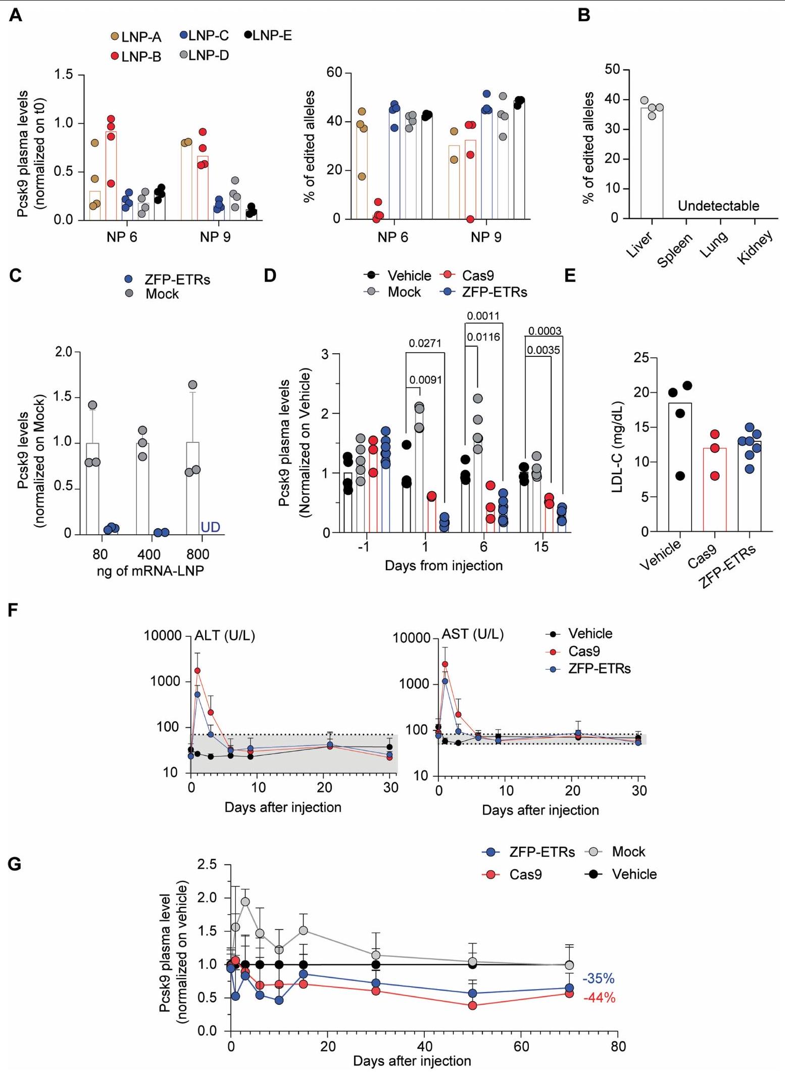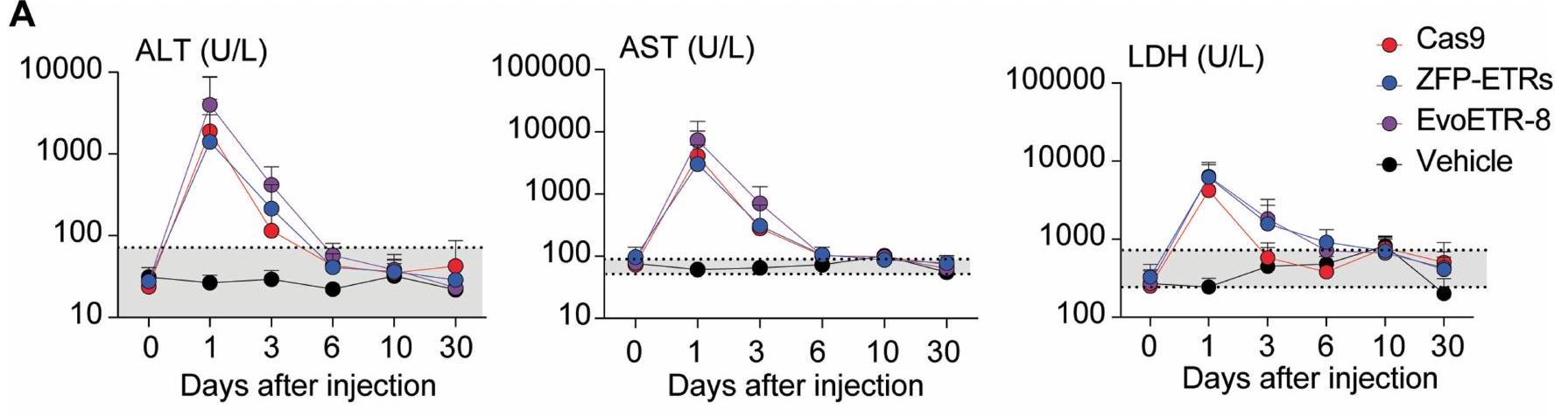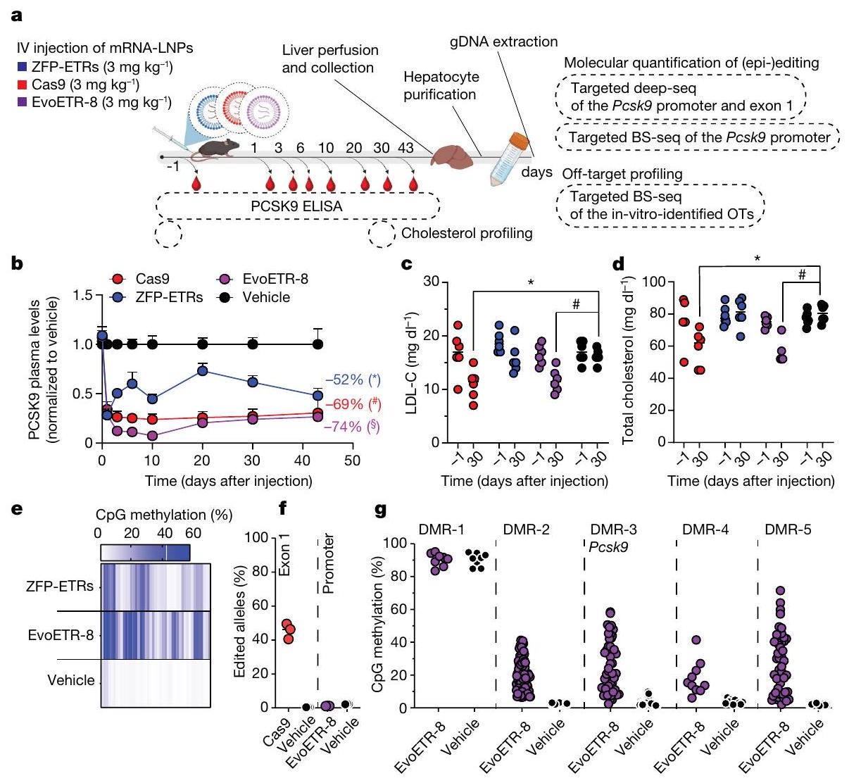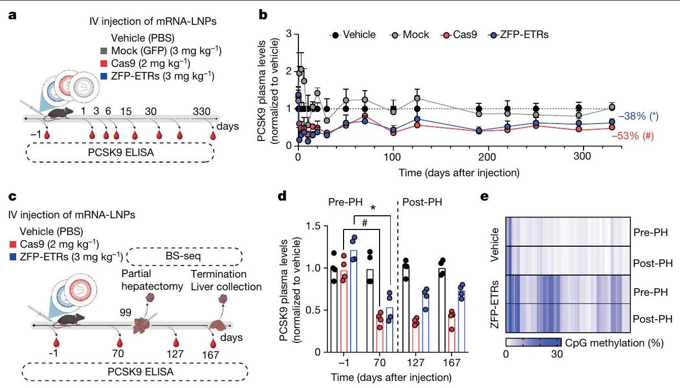 الإجراء الذي تم استخدامه لتقييم متانة التحرير بعد استئصال الكبد الجزئي. تسلسل البيسلفيت المستهدف، تسلسل BS.BioRender.com. د، رسم بياني عمودي يوضح مستويات PCSK9 قبل وبعد استئصال الكبد الجزئي (PH). تم تطبيع بيانات الفئران الفردية إلى متوسط الفئران المعالجة بالعلاج الوهمي (نقاط)؛ تشير الأعمدة إلى الوسيط (تم إجراء التحليل الإحصائي بواسطة تحليل التباين الثنائي الاتجاه RM ANOVA واختبار المقارنات المتعددة لدونيت بين العينات التي تنتمي إلى نفس المعاملة (وهمية، ZFP-ETRs وCas9) في أوقات مختلفة. و ). إذا لم يُذكر، فإن الفروقات لم تكن ذات دلالة إحصائية. e، خريطة حرارية تُظهر متوسط الميثيلation عند دقة CpG المفرد داخل CGI الخاص بـ Pcsk9 في العينات المعالجة (ZFP-ETRs) وعينات التحكم (المركبة) قبل وبعد استئصال الكبد الجزئي. تشير كثافة اللون إلى نسبة ميثيلation CpG (متوسط لكل مجموعة تجريبية). يمثل كل مستطيل CpG فردي في المنطقة الجينومية Chr. 4:106,463,706-106,464,363. طرق توصيل الجينات، قمنا بإجراء فحص داخل الجسم لتحديد الجسيمات النانوية الدهنية (LNPs)متوافق مع نقل آلية التحرير إلى الكبد. هنا، استخدمنا تعطيل Pcsk9 بواسطة CRISPR-Cas9 كقراءة بديلة لتوصيل RNAs المحررين بواسطة LNP. ومع ذلك، في مجال تحرير Pcsk9، تمثل CRISPR-Cas9 معيارًا للطرق الناشئة في التحرير. من بين عشرة LNPs تم اختبارها، سبعة منها أدت إلى تقليل قوي في مستويات PCSK9 الدائرة (أكثر من 60%) وتحرير جيني فعال (الشكل 3a من البيانات الموسعة). من بين هؤلاء السبعة، تم اختيار LNP D للدراسات الإضافية، نظرًا لملف توزيعها الحيوي السليم وملف السمية (الشكل 3b من البيانات الموسعة). ثم قمنا بإنتاج mRNAs التي تشفر الثلاثة ZFP-ETRs مع تعديلات متطورة تهدف إلى تعظيم ترجمة RNA واستقراره وتقليل الاستجابات المناعية الفطرية.. تم تعبئة هذه الرنا المرسال في تركيبة LNP المختارة لاختبار أولي في خلايا الكبد الأولية المستزرعة من الفئران، حيث لاحظنا فقدانًا شبه كامل لـ PCSK9 في سوائل الخلايا (الشكل التمديدي 3c). استنادًا إلى هذه النتائج، قمنا بإعطاء LNPs المحملة بـ ETR عن طريق الوريد لفئران C57BL/6 البالغة ورصدنا مستويات PCSK9 المتداولة لمدة تصل إلى 330 يومًا، عندما تم إنهاء التجربة (الشكل 3a). تم استخدام الفئران المعالجة بـ PBS (المركب هنا) أو التي تم حقنها بـ LNPs المحملة برنا mRNA eGFP (المزيف هنا) كضوابط. أظهرت التحليلات المبكرة للفئران المعالجة بـ ETR انخفاضًا سريعًا وعميقًا في PCSK9، والذي استقر بعد ذلك عند حوالي مستويات المركبات المعالجة حتى آخر نقطة زمنية تم تحليلها (الشكل 3d من البيانات الموسعة والشكل 3b). تماشيًا مع هذه البيانات، في اليوم 30 بعد حقن LNP، كانت مستويات الكوليسترول المرتبط بـ LDL (LDL-C) قد انخفضت في الفئران المعالجة بـ ETR (حوالي 35٪؛ الشكل 3e من البيانات الموسعة). تم ملاحظة كفاءات وسرعات مماثلة في تقليل PCSK9 وLDL-C في الفئران التي تم علاجها بـ LNPs المحملة بـ RNAs المستهدفة لـ Pcsk9 باستخدام تقنية CRISPR-Cas9. (الشكل 3ب والشكل الإضافي 3د، هـ). كانت السموم المرتبطة بالعلاج محصورة ذاتيًا، مع زيادات مؤقتة في إنزيمات الكبد الألانين ترانس أميناز (ALT) والأسبارتات ترانس أميناز (AST) بمستويات قابلة للمقارنة بين مجموعات المعالجة باستخدام CRISPR-Cas9 و ZFP-ETR (الشكل الإضافي 3و). نظرًا لأن دراسة سابقة لم تُظهر أي سمية كبدية كبيرة عند استخدام نفس مكونات CRISPR-Cas9 المستهدفة لـ Pcsk9 ولكن محملة في صيغة LNP مختلفة.، استنتجنا أن الزيادة في الإنزيمات التي لاحظناها هنا كانت على الأرجح نتيجة لصيغة LNP المستخدمة في هذه الدراسة. لتأكيد وتوسيع نتائجنا، عالجنا مجموعة ثانية من الفئران باستخدام LNPs المحملة بـ ETR (الشكل 3g من البيانات الموسعة) وبعد ثلاثة أشهر، خضع أربعة منها لعملية استئصال جزئي للكبد (الشكل 3c)، وهي إجراء جراحي يحفز موجات قوية من تكاثر خلايا الكبد لتجديد الفصوص الكبدية المستأصلة.من الجدير بالذكر أنه لم يتم العثور على اختلافات كبيرة في مستويات PCSK9 المتداولة بين الفئران قبل وبعد استئصال الكبد، مما ي