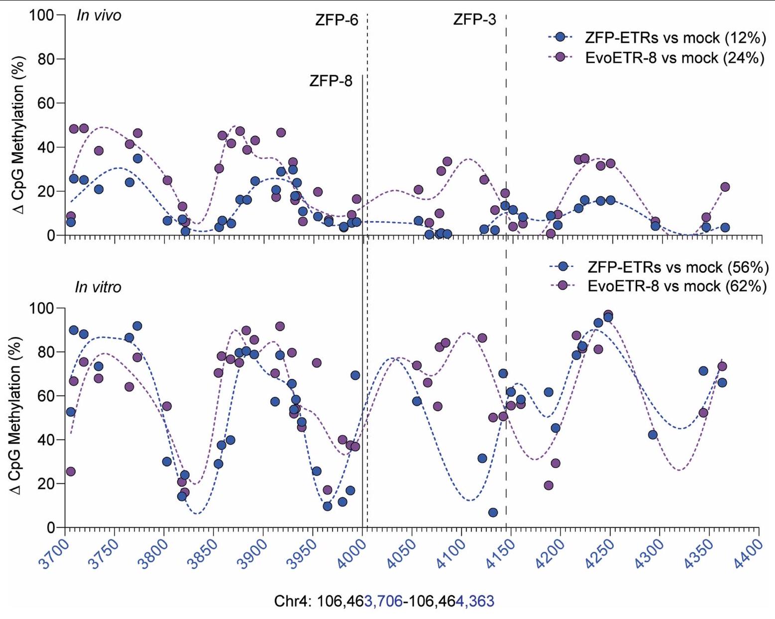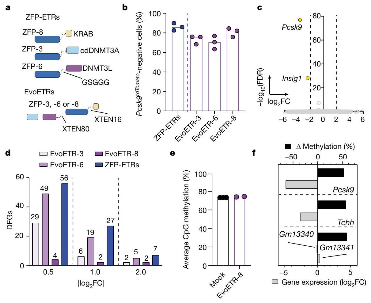العتبات.d، رسم بياني عمودي يوضح عدد الجينات المعبر عنها بشكل مختلف (DEGs) من العينات المحددة مقابل الخلايا غير المعالجة. تم إجراء هذه التحليلات في ثلاثة أوقات مختلفةعتبات و فيرسم بياني عمودي يوضح مستويات الميثيلation CpG على مستوى الجينوم للعينات المحددة كما تم حسابها من تحليلات WGMSللمعالجة الوهمية ولخلايا المعالجة بـ EvoETR-8).رسم بياني عمودي يوضح العلاقة بين الميثلة التفاضلية وتغير التعبير الجيني للمقارنة بين EvoETR-8 وmock. كانت مناطق الميثلة المختلفة مرتبطة بجين معين عندما تقع ضمننافذة حول نظام TSS الخاص بها. تم رسم الجينات التي لهايمكن حساب FDR من تحليل التعبير التفاضلي. تشير القضبان السوداء إلى التباين في مستويات الميثيلation المتوسطة لمناطق DMRs. دمج ثلاثي ETR في جزيء شامل (تصميم يُشار إليه بشكل جماعي باسم ETR المتطور؛ EvoETR). لتحقيق ذلك، أضفنا في الطرف N من ZFP DBD ثنائي هجين إلزامي بين cdDNMT3A وDNMT3L، وفي الطرف C، مجال KRAB (الشكل 4a)، وهو تصميم يذكر بالمحررات الجينية الوصفية سابقًا.لتقييم أي من الثلاثة مصفوفات ZFP المستخدمة في تركيبة الثلاثي-ETR (ZFP-3، ZFP-6 أو ZFP-8) كانت الأنسب لتكوين شامل، قمنا ببناء EvoETRs لكل من هذه المصفوفات وقيمنا كفاءتها في الإيبي-إسكات في Hepa 1-6 Pcsk.الخلايا. جميع التركيبات أنتجت مستويات عالية ودائمة منالصمت، الذي كان قابلاً للمقارنة مع تلك التي تم الحصول عليها مع مجموعة الثلاثي-ETR (الشكل 4ب). أظهر تحليل النسخ للخلايا التي تم صمت Pcsk9 من جميع ظروف العلاج أن EvoETR المزود بـ ZFP-8 (المشار إليه فيما بعد بـ EvoETR-8) كان الأكثر تحديدًا، وكان هذا صحيحًا عبر عتبات تغيير الطي المتزايد (من 0.5 إلى“; الشكل 4ج، د، الشكل البياني الممتد 4 والجدول التكميلي 3). لا يوجد أي من هذه الجينات المعبر عنها بشكل مختلف (DEGs؛ حتى أربعة عندتمت مشاركة ) مع مجموعة الثلاثة ETR، على عكس EvoETRs المجهزة بـ ZFP-6 و ZFP-3، التي شاركت ما يصل إلى عشرة وثلاثة DEGs – بما في ذلك Pcsk9 – مع مجموعة الثلاثة ETR، على التوالي (; الشكل 4 د والجداول التكميلية 3 و 4). كانت مستويات الميثيل في CpG على مستوى الجينوم متشابهة إلى حد كبير بين الخلايا المعالجة بالتحكم والخلايا المعالجة بـ EvoETR-8 (الشكل 4هـ). أظهرت الأخيرة خمسة مناطق ميثيلية مختلفة (DMRs)، ثلاثة منها تم توضيحها لأربعة جينات (الشكل 4و والجدول التكميلية 5)، بما في ذلك Pcsk9، الجين الوحيد إظهار تنظيم تنازلي ملحوظ (كانت هذه الأرقام أقل من تلك التي لوحظت مع مجموعة الثلاثي-ETR (الشكل 2c والجدول التكميلي 2). بشكل عام، تشير هذه البيانات إلى أن EvoETR-8 هو أفضل كاشف من حيث الأداء والخصوصية لتخفيض Pcsk9. علاوة على ذلك، تشير إلى أن الاضطرابات التي لوحظت مع مجموعة الثلاثي-ETR كانت على الأقل جزئيًا بسبب استهداف ZFP-3 وZFP-6 خارج الهدف، وكلاهما أظهر أيضًا ملف استهداف خارج الهدف بشكل فردي.