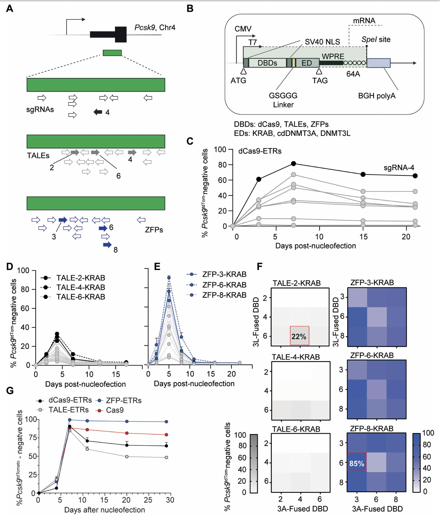 لاختيار هياكل ETR بسرعة ضد Pcsk9، قمنا بتطوير خط خلايا كبد الفأر المهندسة الذي يُظهر النشاط النسخي لهذا الجين على مستوى الخلية الواحدة (المشار إليه فيما بعد بـ Hepa 1-6Pcsk).الخلايا؛ الشكل 1أ). باستخدام هذا الخط، اختبرنا بشكل منفصل وسمينا أكثر تركيبة ETR ثلاثية فعالية لكل من منصات DBD القابلة للبرمجة التالية التي تستهدف جزيرة CpG (CGI) التي تشمل منطقة المحفز لجين Pcsk9: dCas9، TALEs و ZFPs (الشكل 1أ والبيانات الموسعة الشكل 1أ، ب). على وجه التحديد، بالنسبة لتركيبات ETR المعتمدة على dCas9، قمنا بنقل ثمانية RNA دليل فردي (sgRNAs) معًا مع تركيبة ETR ثلاثية تم وصفها سابقًا.في Hepa1-6Pcsk9الخلايا والمحدد“، الذي يحفز أعلى مستويات كبت Pcsk9 (الشكل البياني الممتد 1a، c). بالنسبة لمستقبلات ETR المعتمدة على TALE، اتبعنا نهجًا متسلسلًا. أولاً، قمنا بدمج مجال KRAB مع 16 TALE وحددنا أفضل 3 أداءً من خلال قياس تثبيط Pcsk9 في ذروة نشاط KRAB المؤقت (الشكل البياني الممتد 1a، d). ثم قمنا ببناء ETRs تحتوي على KRAB، cdDNMT3A أو DNMT3L لكل من المصفوفات المختارة وقدمنا جميع التباديل الممكنة لهذه ETRs كتركيبات ثلاثية في Hepa1-6Pcsk9.الخلايا. باستخدام كفاءة كبح Pcsk9 كقراءة، اخترنا أخيرًا TALE-2 وTALE-4 وTALE-6 المدمجة مع KRAB وcdDNMT3A وDNMT3L، على التوالي (الشكل البياني الممتد 1f). تم استخدام استراتيجية اختيار مماثلة لـ ETRs المعتمدة على ZFP. مما أدى إلى دمج ZFP-3 و ZFP-6 و ZFP-8 مع cdDNMT3A و DNMT3L و KRAB، على التوالي (الشكل 1a,e,f من البيانات الموسعة). بناءً على هذه البيانات، أجرينا تجربة استجابة للجرعة في Hepa 1-6Pcskتم إدخال خلايا عن طريق نقل RNAs لمجموعات ETR الثلاثية المختارة المستندة إلى dCas9 و TALE و ZFP (الشكل 1b). كشفت هذه الدراسات عن اختلافات ملحوظة في الديناميكا الدوائية بين المنصات الثلاثة لـ ETR. على وجه التحديد، كانت ETRs المستندة إلى ZFP أكثر فعالية بمقدار 5.7 مرة و 2.8 مرة مقارنة بالهياكل المستندة إلى dCas9 و TALE، على التوالي، في كتم Pcsk9 (الشكل 1b). ومع ذلك، من حيث الفعالية القصوى، تفوقت كل من ETRs المستندة إلى ZFP و dCas9 على الهياكل المستندة إلى TALE، حيث وصلت إلى ما لا يقل عن 80% من كتم Pcsk9 (الشكل 1b). كانت هذه القيم الأخيرة قابلة للمقارنة مع – إن لم تكن أعلى من – تلك التي لوحظت بعد التفعيل الجيني لـ Pcsk9 باستخدام كميات متطابقة من RNA المشفر لـ CRISPR-Cas9 النشط تحفيزياً. أثبتت تعطيل الجين وكتم Pcsk9 أنهما مستقران حتى اليوم 28، وهو آخر نقطة زمنية تم تحليلها (الشكل 1c والشكل الممتد 1g). بناءً على هذه النتائج، اخترنا ETRs المستندة إلى ZFP المذكورة أعلاه لدراساتنا اللاحقة.