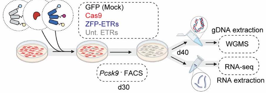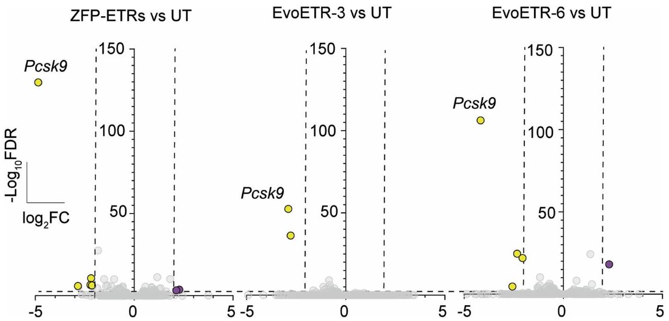 ثم قمنا بتقييم ملف الخصوصية لمستقبلات ZFP-ETRs من خلال تحليلات النسخ الجيني وميثيل الحمض النووي لعلاج ETR لخلايا Hepa 1-6 Pcsk.الخلايا باستخدام تسلسل RNA (RNA-seq) وتسلسل الميثيلوم الكامل للجينوم (WGMS) (الشكل 2a من البيانات الموسعة)، على التوالي. تم استخدام خلايا تم نقلها برسائل RNA تشفر لـ eGFP (المشار إليها فيما بعد بالتحكم) أو لـ CRISPR-Cas9 المستهدف لـ Pcsk9 للتحكم في التأثيرات المتعلقة بالعلاج و/أوتفعيل. بالإضافة إلى ذلك، تم نقل الخلايا باستخدام مجموعة ثلاثية من ETR مزودة بمصفوفة ZFP