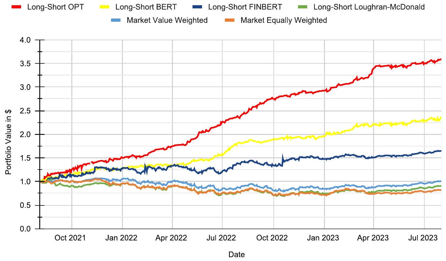 Finally, we examine the outcomes of trading strategies based on news sentiment including a 10 bps trading cost from August 2021 to July 2023. Fig. 1 illustrates the performance of various strategies, notably highlighting the long-short OPT strategy with an impressive gain. This underscores the powerful predictive capability of advanced language models in forecasting market movements. Other strategies, such as long-short BERT and long-short FinBERT, also register significant gains of and , in stark contrast to traditional market portfolios, which barely exceed . Conversely, the Loughran-McDonald dictionary model, extensively employed in finance research, managed only a return. This pronounced disparity suggests that dictionary-based models do not effectively interpret the nuanced sentiments present in contemporary financial news as efficiently as more advanced language models. This analysis substantiates the importance of employing sophisticated language models in developing investment strategies based on news sentiment.