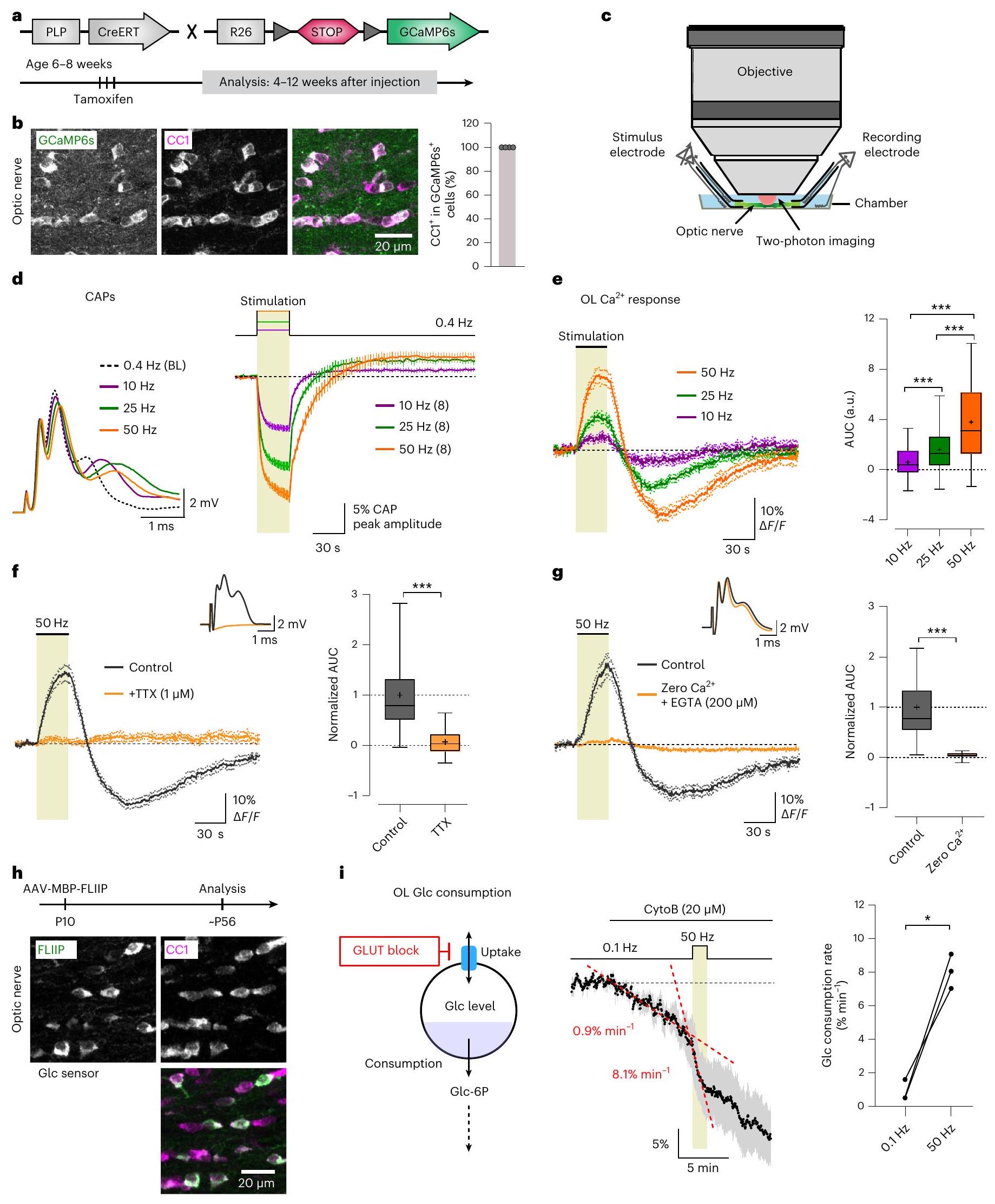 الشكل 1|النشاط المحوري المستحثالإشارات وتدفق الجليكوليز في خلايا الدبق البصري. أ، توليد وعلاج التاموكسيفين لفئران PLP-CreERT؛ RCL-GCaMP6s في عمر 6-8 أسابيع؛ تم إجراء التجارب بعد 4-12 أسبوعًا من الحقن. ب، يسارًا، صور المناعية الكيميائية للتعبير عن GCaMP6s في خلايا الدبق (أجسام مضادة مضادة للبروتين الفلوري الأخضر (anti-GFP)، باللون الأخضر؛ أجسام مضادة مضادة لـ CC1، باللون الأرجواني). يمينًا، نسبة الخلايا الإيجابية لـ GCaMP6s التي هي أيضًا إيجابية لـ CC1.الفئران، دوائر رمادية). ج، تحضير العصب البصري للاختبارات الكهربائية والتصوير. د، يسار، مثال على CAPs عند 0.4 هرتز (الخط الأساسي (BL)) وبعدتحفيز عند 10 و 25 أو 50 هرتز. اليمين، مسار الزمن (المتوسطالانحراف المعياري (s.e.m.) لسعة قمة CAP 2 بالنسبة للخط الأساسي (فئران). هـ، استجابات (تعني s.e.m.) لتحفيزات محورية مختلفة. على اليمين، مخططات الصندوق تظهر منطقة الاستجابة تحت المنحنى (AUC؛ خلايا من ثمانية فئران). الترددات الأعلى أدت إلى زيادة أكبر الذروات (50 مقابل 25 هرتز، *** ضد ضد “; تحليل التباين أحادي الاتجاه (ANOVA)، اختبار المقارنات المتعددة لتوكاي). ف، اليسار، TTX (ألغى الـOL الناتج عناستجابة. تم تقليل CAP بواسطة TTX. اليمين، استجابات AUC المعيارية قبل وبعد TTX (خلايا من ستة فئران) يظهر انخفاض بنسبة (*** مزدوج الجوانب المقترناختبار). ج، اليسار، إزالة خارج الخلية ( قلل M EGTA من OLاستجابة. إدراج، استجابة CAP في الصفر. صحيح، استجابات AUCs العادية تظهر تقليل (خلايا من ثلاثة فئران،مزدوج الجوانب المقترناختبار). تعبير مستشعر FRET للجلوكوز (Glc) المعتمد على AAV (FLIIP) في خلايا الدبق البصري الناضجة بعد الحقن داخل البطين. أكدت صبغة المناعة باستخدام CC1 (ماجنتا) تعبير FLIIP (أجسام مضادة مضادة لـ GFP، أخضر) في خلايا الدبق الناضجة (تمت ملاحظته في ثلاثة فئران). MBP، بروتين المايلين الأساسي؛ P10، اليوم العاشر بعد الولادة؛ P56، تقريبًا يوم ما بعد الولادةيسار، مخطط لاستهلاك الجلوكوز بعد تثبيط امتصاص الجلوكوز باستخدام مثبط ناقل الجلوكوز (GLUT) CytoB. Glc-6P، جلوكوز 6-فوسفات. في المنتصف، مسار الزمن لانخفاض الجلوكوز خلال حاضنة CytoB عند 0.1 هرتز وعند حدوث مؤقت.تحفيز (يعنيمعدل الانخفاض المتوسط (الخطوط الحمراء المتقطعة) زاد منعند 0.1 هرتز إلىعند 50 هرتز. صحيح، الرسم البياني يوضح معدلات استهلاك الجلوكوز (فئرانمزدوج الجوانباختبار). تُظهر الرسوم البيانية الصندوقية الوسيط (الخط المركزي)، والرباعيات (حدود الصندوق)، والمتوسط ( + ) والنسب المئوية من 5 إلى 95 (الشعيرات). الاستجابة بنسبة تقارب 20% (الشكل البياني 2b). ثم قمنا بفحص الإشارات البورينية، نظرًا لأن ATP قد يعمل كجزيء إشارة في المادة البيضاء وتعبّر خلايا OL عن مستقبلات P2X/P2Y.مضادات مستقبلات P2X/P2Y غير الانتقائية واسعة الطيف حمض البيريدوكسايل فوسفات-6-أزو فينيل-2’،4′-ثنائي السلفونيك (PPADS; ) وسورامين ( ) خفضت الـ استجابة من (الشكل البياني الموسع 2c، d). وبالتالي، تساهم كل من الإشارات البورينرجية والغلوتاماترية بشكل معتدل في OLاستجابة.