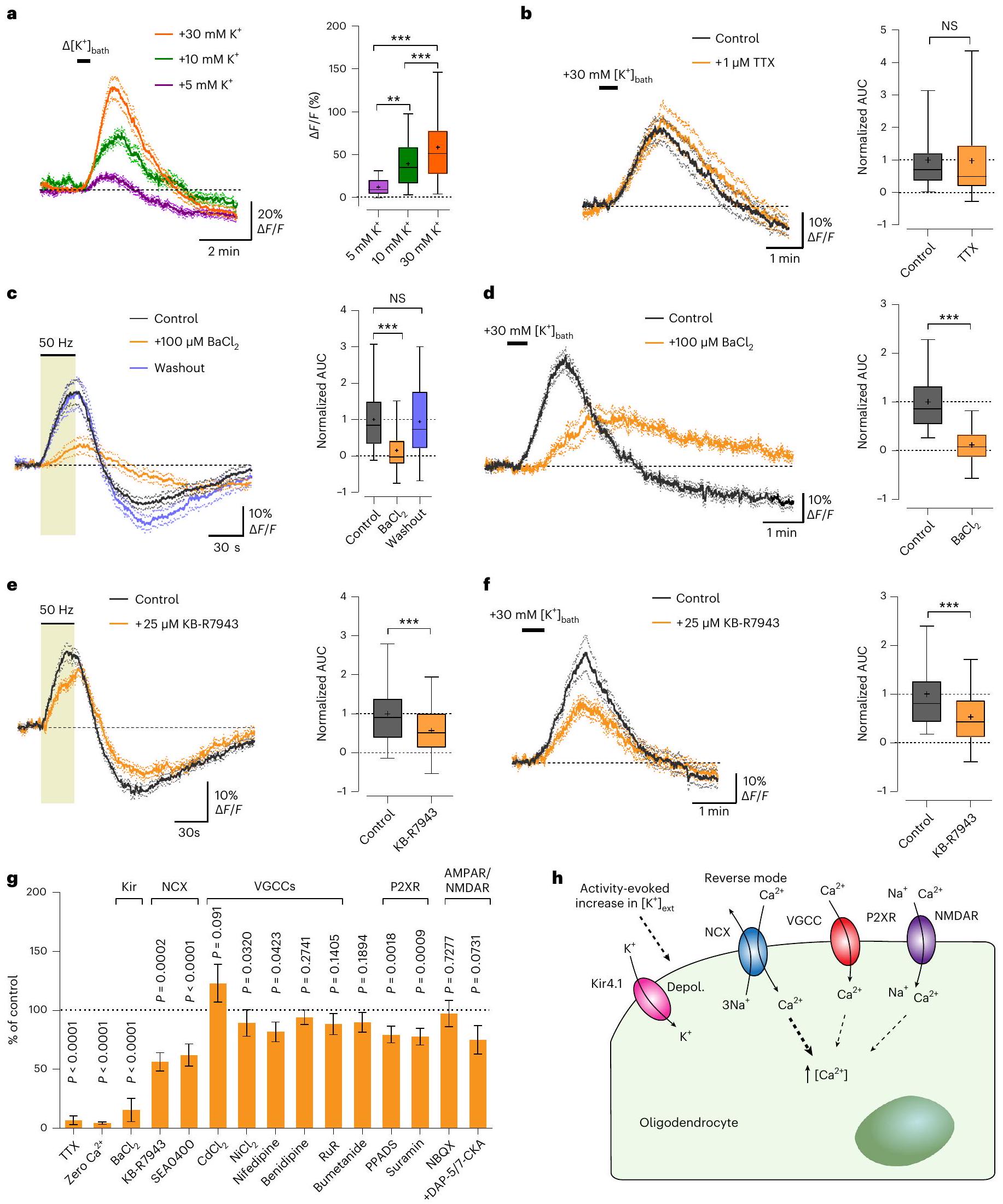 مثبط NCX في وضع العكس KB-R7943 ) خفضت الـ -المُحفَززيادة (e) بـخلايا من خمسة فئران؛ متزاوجةاختبار، و الـ -استدعىاستجابة (ف) بواسطة ( خلايا من ثلاثة فئران؛ مزدوجة الجوانب مرتبطةاختبار، ). تُظهر الرسوم البيانية الصندوقية على اليمين استجابات AUC المُعَيارَة. ج، ملخص للأدوية التي تم اختبارها وتأثيراتها المثبطة على -استجابة OLالارتفاعات (تُعرض البيانات أيضًا كرسوم بيانية صندوقية تشمل المعنية)القيم في ج و هـ، الشكل 1f، g، والأشكال الإضافية 2، 4 و 5): TTX (صفر كا، نيفيديبينبيني ديبين ) ، بوميتانيد ), PPADS ( سورامين ), NBQX ( ) و +DAP-5/7-CKA ( ). AMPAR، مستقبل AMPA؛ NMDAR، مستقبل NMDA. h، مخطط لنشاط المحور العصبي المدعوم بـالتفعيل: زيادة النشاط المحوري عالي الترددإزالة الاستقطاب (Depol.) OLs من خلال Kir4.1 وزيادةالدخول من خلال NCX. يتم توضيح المساهمات الطفيفة لقنوات الكالسيوم المعتمدة على الجهد، وم receptors P2X، ومستقبلات NMDA. الرسوم البيانية الصندوقية فيعرض الوسيط (الخط المركزي)، الربعيات (حدود الصندوق)، المتوسط (+) والنسب المئوية من 5 إلى 95 (الشعيرات). بواسطةSEA0400، مثبط آخر لـ NCX (الشكل 5c من البيانات الموسعة). كما أن KB-R7943 قلل مناستدعىاستجابة في OLs (الشكل 2f)، مما يشير إلى أنالاستقطاب الناتج عن التحفيز في خلايا OLs يؤدي إلىالدخول من خلال وضع العكس لـ NCX. يتم التعبير عن الناقل المشترك 1 (NKCC1) في الخلايا الدبقية الناضجة.وقد تلعب دورًا في تنظيم حجم اللسان الداخلي المواجه للمحوار. لقد اختبرنا ما إذا كان تشارك الناقلات المشتركة في تحفيز OLزيادة باستخدام بوميتانيد، مثبط محدد لـ NKCC1. ومع ذلك،لم يؤثر بوميتانيد علىOL Ca الناتج عنزيادة (الشكل 5d من البيانات الموسعة)، مما يشير إلى أن التغيرات في الحجم التي يسببها NKCC1 في خلايا OL البالغة ليست متورطة خلال إطلاق النار المحوري عالي التردد.