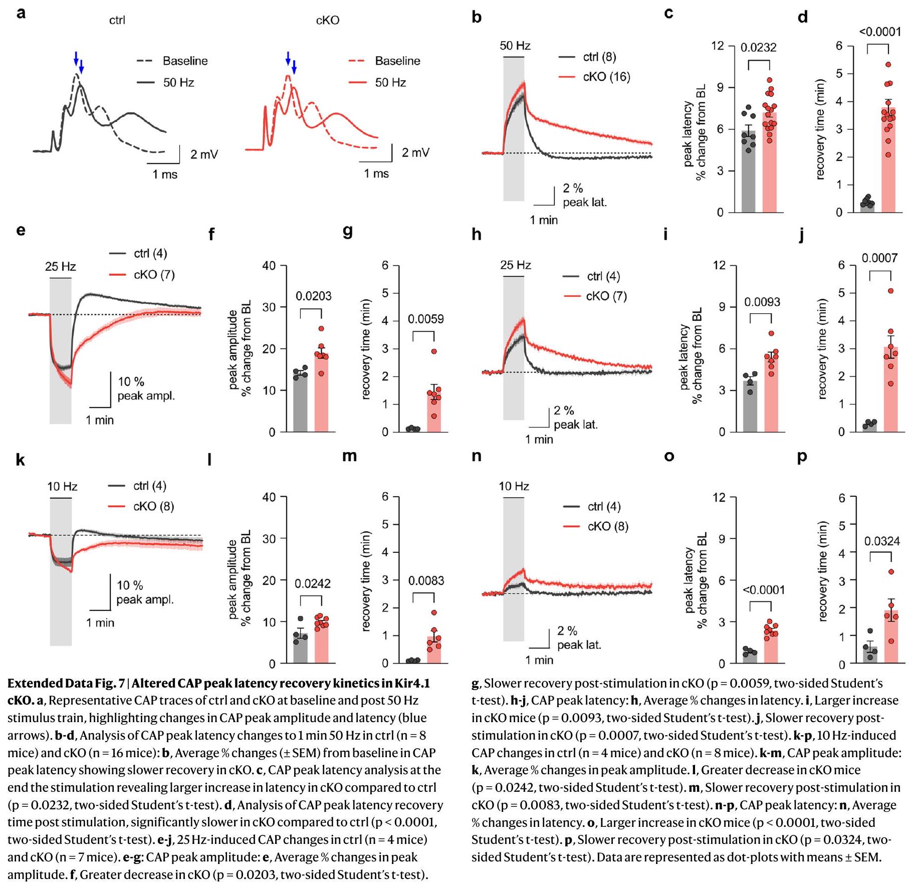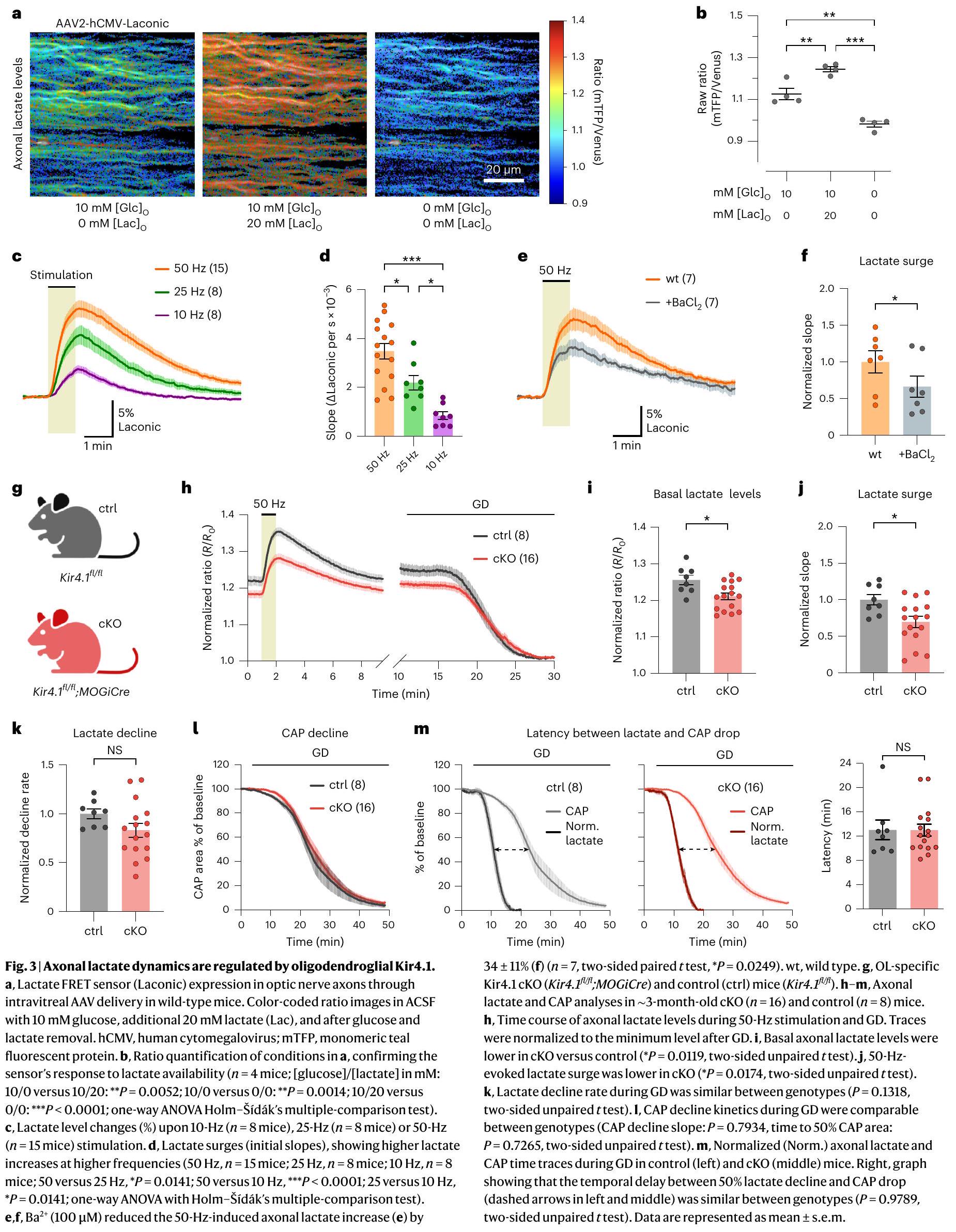 للتحقيق فيما إذا كانت خلايا أوليجودينروغليا Kir4.1 تتحكم بشكل محدد في ديناميات اللاكتات المحورية، استخدمنا فئران Kir4.1 cKO. (الشكل 3g والشكل الإضافي 6). أولاً، قمنا بفحص الأعصاب البصرية من فئران Kir4.1 cKO التي تبلغ من العمر -شهرًا وأقرانها من نفس السلالة (Kir4.لم نجد أي اختلافات في أوقات ذروة CAP أو قابلية العصب للإثارة (الشكل 6 أ-ج في البيانات الموسعة). بالإضافة إلى ذلك، لم نلاحظ أي تغييرات واضحة في سمك غلاف المايلين وتوزيع قطر المحاور المايلينية (الشكل 6 د-و في البيانات الموسعة). في هذا العمر، لم تُلاحظ أي علامات على تلف المحاور أو الالتهاب العصبي (الشكل 6 د، ز، ح في البيانات الموسعة). التأثير الوسيط على تأخير تعافي ذروة CAP (الشكل 3f من البيانات الموسعة) قد يتضمن الوساطة بواسطة Kir4.1إزالة بواسطة الخلايا العصبية الدبقية و/أو الخلايا النجميةمن الجدير بالذكر أن أعصاب Kir4.1cKO أظهرت تعافيًا أبطأ بشكل ملحوظ في ذروة CAP بعد التحفيز عالي التردد مقارنةً بالتحكمات من نفس السلالة (الشكل 6i,j في البيانات الموسعة)، مما يؤكد النتائج السابقة.. من المثير للاهتمام، أن الأعصاب من النوع البري المعالجة بـأظهرت تأخيرات التعافي نفسها كما في أعصاب Kir4.1 cKO (الشكل 6i,j من البيانات الموسعة)، مما يوحي بأن Kir4.1 في الخلايا الدبقية قليلة التغصن متورط بشكل أساسي فيالتخزين في المادة البيضاء البالغة، مع مساهمة قليلة أو معدومة من كير4.1 الأستروسيتية أو غيرها-قنوات كير الحساسة. كما تأثرت ديناميات استعادة زمن ذروة CAP في أعصاب Kir4.1 cKO (الشكل التوضيحي الممتد 7a-d). كانت عيوب استعادة CAP بعد التحفيز مرئية أيضًا عند 25 و 10 هرتز (الشكل التوضيحي الممتد 7e-p)، مما يوضح أن Kir4.1 في الخلايا الدبقية قليلة التغصن تتحكم أيضًا في الاعتماد على النشاط.إزالة عند الترددات المنخفضة.
