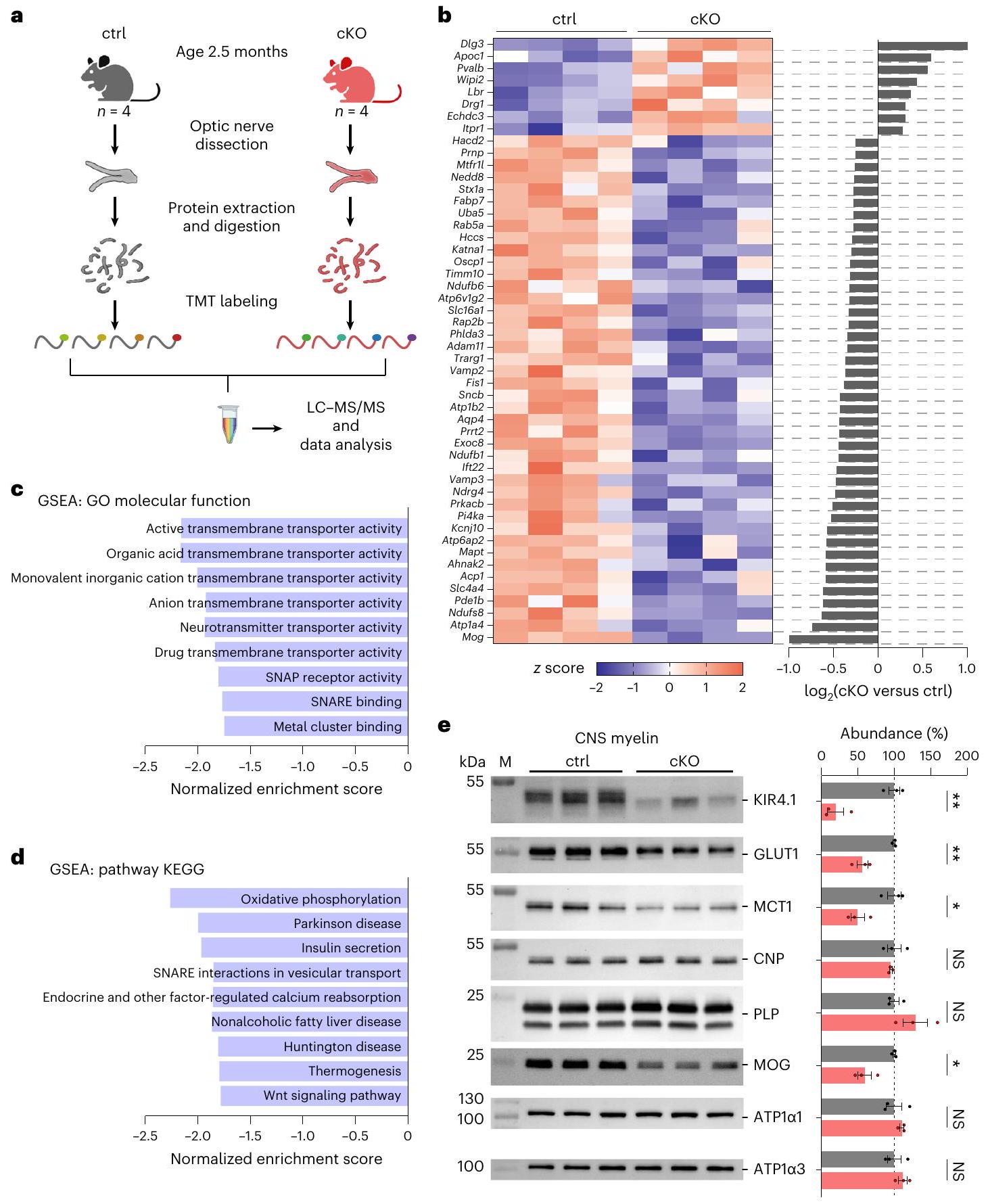 “يبدو أن غياب كير4.1 في الخلايا الدبقية قليلة التغصن في الفئران الصغيرة يؤثر على استقلاب الطاقة المحوري قبل ظهور أمراض المحاور. يتماشى هذا مع انخفاض مستويات اللاكتات المحورية الملحوظة في أعصاب الفئران الصغيرة cKO، التي لم تظهر أي ضرر محوري أو التهاب عصبي. أثر كل من تثبيط الأدوية والتعطيل الجيني لكير4.1 على الزيادة المفاجئة في اللاكتات المحورية المستحثة بالتحفيز، لكن مستوى اللاكتات الأساسي المنخفض كان سمة إضافية لفئران cKO. بالإضافة إلى تنظيم الاقتران الأيضي الحاد، قد يساهم كير4.1 في الخلايا الدبقية قليلة التغصن أيضًا في ضبط وحدة الأيض بين المحور والخلايا الدبقية. لاستكشاف التغيرات الأيضية الناتجة عن نقص كير4.1 بشكل أكبر، قمنا بإجراء بروتيوميات كمية تعتمد على علامة الكتلة المتسلسلة (TMT) على مستخلصات العصب البصري من فئران كير4.1 cKO البالغة من العمر 2.5 شهرًا ومجموعة التحكم (الشكل 4أ، الشكل التمديدي 9أ والبيانات التكميلية 1). كما هو متوقع، كانت مستويات بروتين كير4.1 (Kcnj1O) أقل في مجموعة cKO (الشكل 4ب والشكل التمديدي 9ب). من بين أفضل 50 بروتينًا مرتبة حسب معدل الاكتشاف الخاطئ (FDR)، أظهرت البروتينات المرتبطة بالنقل الحويصلي واستقلاب الطاقة مستويات منخفضة (الشكل 4ب). كشفت تحليلات إثراء مجموعة الجينات والمسارات عن انخفاض في نشاط الناقلات عبر الغشاء، والنقل الحويصلي ومسارات الفسفرة التأكسدية (الشكل 4ج، د). لوحظ انخفاض في وفرة MCT1 (Slc16a1؛ الشكل 4ب والشكل التمديدي 9ج) وGLUT1 (Slc2a1؛ الشكل التمديدي 9د)، لكن لم يكن هناك تغيير في ناقل الجلوكوز GLUT3 (Slc2a3؛ الشكل التمديدي 9هـ). أشار تحليل qPCR الإضافي إلى انخفاض طفيف في mRNA الخاص بـ Slc2a1 ولكن ليس في mRNA الخاص بـ Slc16a1 (الشكل التمديدي 8ف)، مما يوحي بأن التغيرات في وفرة الناقلات قد لا تكون ناتجة فقط عن تغييرات في التعبير الجيني. أظهر التحليل المناعي للميالين المستخلص من أدمغة cKO انخفاضًا بنسبة حوالي 50% في وفرة كل من GLUT1 وMCT1 (الشكل 4هـ). وبالتالي، أثر فقدان كير4.1 على الوفرة النسبية لناقلات المستقويمكن أن تؤثر الإشارات التي تتوسطها Kir4.1 على تعبير الجينات، وتخليق البروتين، ونقل السطح، و/أو دوران الناقلات الأيضية في خلايا الدبق. قد يؤدي ذلك إلى تكيفات تتماشى مع دعم الآلات في خلايا الدبق لمستويات نشاط المحاور.