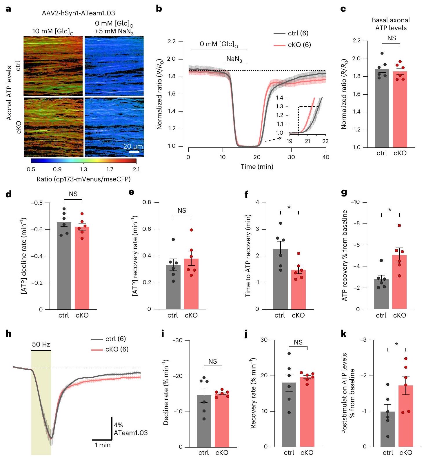 نظرًا لأن استعادة أوقات الذروة لـ CAP بعد التحفيز عالي التردد كانت منخفضة في الفئران المعدلة وراثيًا (الشكل 7 من البيانات الموسعة)، تساءلنا عما إذا كان هذا يتوافق أيضًا مع استعادة ATP المحوري. لذلك