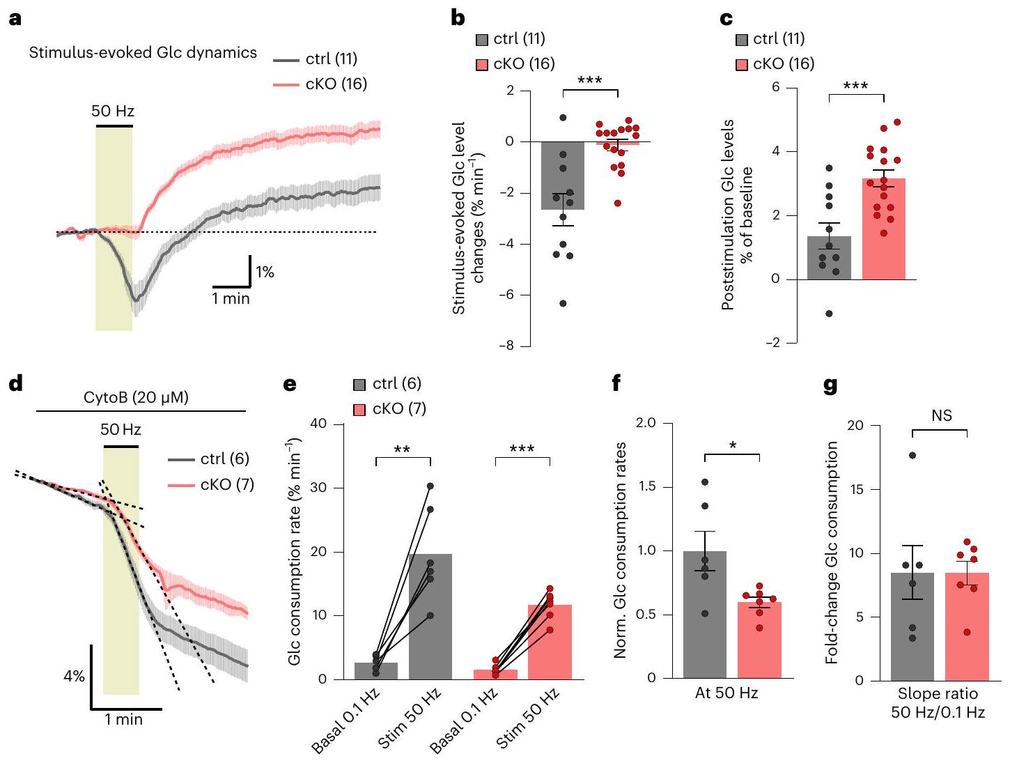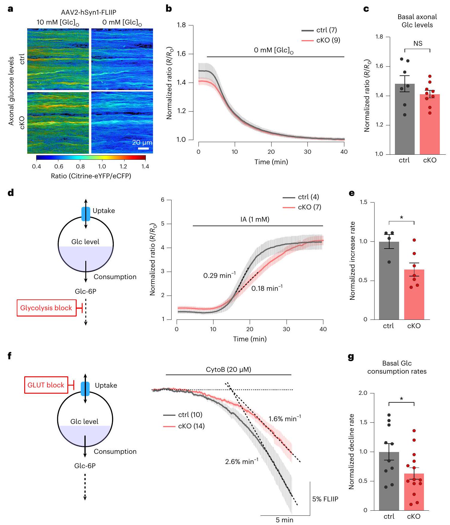 أثناء اختبار ما إذا كانت ديناميات الجلوكوز المحوري تختلف خلالعند التحفيز، لاحظنا أن مستويات الجلوكوز انخفضت في المحاور الضابطة لكنها ظلت ثابتة في المحاور cKO (الشكل 7أ، ب). وهذا يشير إلى تنشيط أقوى للجليكوليز مقارنةً بامتصاص الجلوكوز في المحاور الضابطة، بينما كانت متوازنة في المحاور cKO. بعد التحفيز، زادت مستويات الجلوكوز فوق المستوى الأساسي في كلا المجموعتين (الشكل 7أ، ج)، مما يوحي باستمرار تنشيط امتصاص الجلوكوز بعد انتهاء التحفيز. قد تكون الفروق في ديناميات الجلوكوز خلال النشاط عالي التردد ناتجة عن انخفاض تنشيط استهلاك الجلوكوز في cKO مقارنةً بالضوابط. في الواقع، زاد التحفيز من استهلاك الجلوكوز المحوري مقارنةً بالأساسي (عندتحفيز) النشاط الجليكولي (الشكل 7د، هـ)، لكن هذه الزيادة كانت أقل في محاور cKO (الشكل 7f). من المثير للاهتمام أن كل من الأعصاب الضابطة و cKO أظهرت زيادة بمقدار ثمانية أضعاف في معدل استهلاك الجلوكوز تحت التحفيز (الشكل 7g). لذلك، على الرغم من أن آلية تنشيط التحلل السكري تظل سليمة في محاور cKO، إلا أن معدل استقلاب الجلوكوز العام لديهم ينخفض بحواليكلاهما في حالة الراحة وأثناء النشاط.