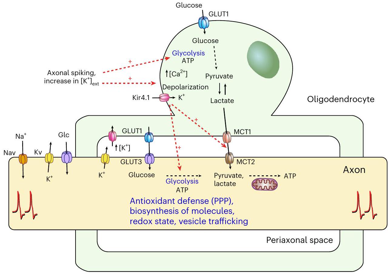 زيادات مؤقتة فيتعتبر علامة مميزة للنشاط المحوري. OLs، قابلة للاختراق بشكل كبير إلىتخفيف الاستقطاب مع الارتفاعات في (المرجع 25) وإطلاق النبضات المحورية، التي تم تسهيلها بواسطةقنوات كير الحساسةالذي يتم التعبير عنه بشكل رئيسي بواسطة خلايا الدبق (OLs) هو Kir4.1تشير نتائجنا إلى أن الوساطة بواسطة Kir4.1الامتصاص هو أمر حاسم في تحفيزتدفق في السومات OL، يسهل بواسطة إزالة استقطاب الغشاء وتنشيط وضعية العكس لـ NCX. هذاالإشارات المدفوعة تنظم الربط الأيضي بين خلايا الدبقية oligodendrocytes والمحاور. قد تؤدي إشارات النشاط الأخرى، مثل الغلوتامات، إلىالنشاط في الميكرو دومينات على طول العقدربما المساعدة في تمايز خلايا OL خلال التطوروتعبير GLUT1 على السطحفي سمك الزرد، تُظهر الأغماد المايلينية للخلايا الدبقية الجديدةإشارات استجابةً للنشاط العصبي. ومع ذلك، في تطوير خلايا OLs الفأرية، تم الإبلاغ عن حدوث التغيرات بشكل مستقل عن نشاط الخلايا العصبية القشريةوجدنا أنه، في أعصاب الفئران البصرية،الإشارات في الخلايا الدهنية الناضجة يتم استحثاثها بشكل رئيسي من خلالتزداد خلال إطلاق النار المحوري عالي التردد.يتم إفرازه عند عقد رانفييهوعلى طول المجالات الجانبية المجاورة للعقد تحت غلاف المايلينمُعَزَّز بالنشاطالتراكم حول خلايا الدبق النخاعي (OLs) قد يكون أكثر وضوحًا في المادة البيضاء البالغة الميالين بالكامل مقارنةً بالمناطق القشرية الميالين بشكل نادر، مما يستدعي مزيدًا من التحقيق. عند اكتشاف نشاط محوري مرتفع، تقوم خلايا الدبق النخاعي بسرعة بزيادة استهلاك الجلوكوز وتوفير اللاكتات أو البيروفات عند الطلب (الشكل 8). من المحتمل أن يتم تحفيز هذه العملية بواسطةوتفعيل Kir4.1. إن تثبيط Kir4.1، الذي يعطل بشكل محدد الإشارات بين المحاور والخلايا الدبقية، قلل من التحفيز و-زيادة اللاكتات المستحثة في المحاور. ومن الجدير بالذكر أن الطرق الدوائية المستخدمة لتقييم ديناميات اللاكتات لم تؤثر على نشاط المحاور أو عبء العمل، مما قد يؤثر على استقلاب المحاور. وبالتالي، فإن زيادات اللاكتات في المحاور تتضمن دعمًا استقلابيًا من الخلايا الدبقية، كما يتضح أكثر من خلال الانخفاض في الزيادات المستحثة للاكتات في الفئران المعدلة وراثيًا التي تفتقر إلى بروتين Kir4.1 الخاص بالخلايا الدبقية.يمكن أن تسرع الزيادات من عملية التحلل السكريوتعزيز إفراز اللاكتات من خلال ناقلات أحادية الكربوكسيلات المرتبطة بالبروتونات. ومن ثم، زيادة البروتونات في OLs، المرتبطة بـ (المرجع 53) ونشاط Kir4.1 قد يسهل إفراز اللاكتات. هناك حاجة لمزيد من البحث لتوضيحآلية إفراز اللاكتات أو البيروفات المدفوعة في خلايا الدبقية. بالإضافة إلى ذلك، الدور المساهم للخلايا النجمية، تحديدًا في المادة البيضاءيتطلب المزيد من الاستكشاف. يؤدي الحذف الجنيني لـ Kir4.1 من كل من الخلايا الدبقية وخلايا سلالة الخلايا الدهنية إلى حدوث أمراض شديدة في المادة البيضاء، بما في ذلك تكوين الفجوات المايلينية..