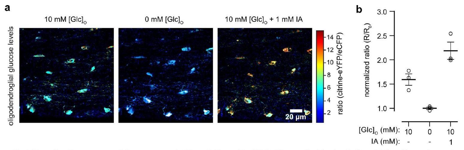 مع الاعتراف بأن خلايا الدبق (OLs) تكتشف النشاط الكهربائي المحوري، تساءلنا بعد ذلك عما إذا كان النشاط المحوري المتزايد يؤثر على تدفق الأيض داخل خلايا الدبق. بالنظر إلى أن خلايا الدبق قد تزود المحاور بمنتجات تحلل السكر مثل البيروفات أو اللاكتات، فإن زيادة النشاط الكهربائي المحوري قد تعزز استهلاك الجلوكوز في خلايا الدبق. لدراسة ذلك، قمنا بتعبير مستشعر الجلوكوز FLII12Pglu700. (FLIIP) في خلايا الدبق العصبي في العصب البصري للفئران من النوع البري من خلال توصيل الفيروس المرتبط بالعدوى (AAV) (الشكل 1h,i). أكدت تلوين CC1 المناعي تعبير المستشعر في خلايا الدبق الناضجة (الشكل 1h). قمنا أولاً بتقييم استجابة المستشعر لتقلبات الجلوكوز. أدى إزالة الجلوكوز خارج الخلوي إلى خفض مستويات الجلوكوز السيتوزولي في خلايا الدبق، بينما أدى حجب التحلل السكري باستخدام 1 مللي مول من اليودوأسيتات (IA) في سائل الدماغ الشوكي الاصطناعي (ACSF) الذي يحتوي على 10 مللي مول من الجلوكوز إلى زيادة مستويات الجلوكوز (الشكل الممتد 1a,b)، مما يؤكد وظيفة المستشعر لدراسة استقلاب الجلوكوز في خلايا الدبق. لتحليل تدفق التحلل السكري، قمنا بتثبيط ناقلات الجلوكوز باستخدامالسيتوكالاسين ب (CytoB) وقمنا بقياس معدل انخفاض الجلوكوز (الشكل 1i)، كما تم توضيحه سابقًابشكل ملحوظ، عابرأدى تحفيز المحاور العصبية إلى تسريع استهلاك الجلوكوز من قبل الخلايا الدبقية قليلة التغصن بحوالي تسع مرات مقارنة بمعدل الأساس عند تحفيز 0.1 هرتز (الشكل 1i). وبالتالي، تستجيب الخلايا الدبقية قليلة التغصن لنبضات المحاور العصبية من خلال زيادة نشاطها الجليكوليتي بسرعة.