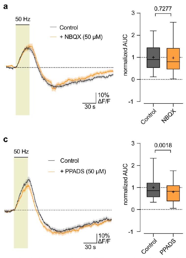 t-test). c, OLCa response with PPADS ( ) revealed a decrease in the stimulus-evoked increase by cells from 3 mice, , two-sided paired t-test). d, OL Ca response with Suramin ( ) revealed a decrease in the stimulus-evoked increase by ( cells from 2 mice, , two-sided paired t-test). Traces represent mean SEM. Boxplots show median (line), quartiles (box bounds), mean (+), and 5-95 percentiles (whiskers).