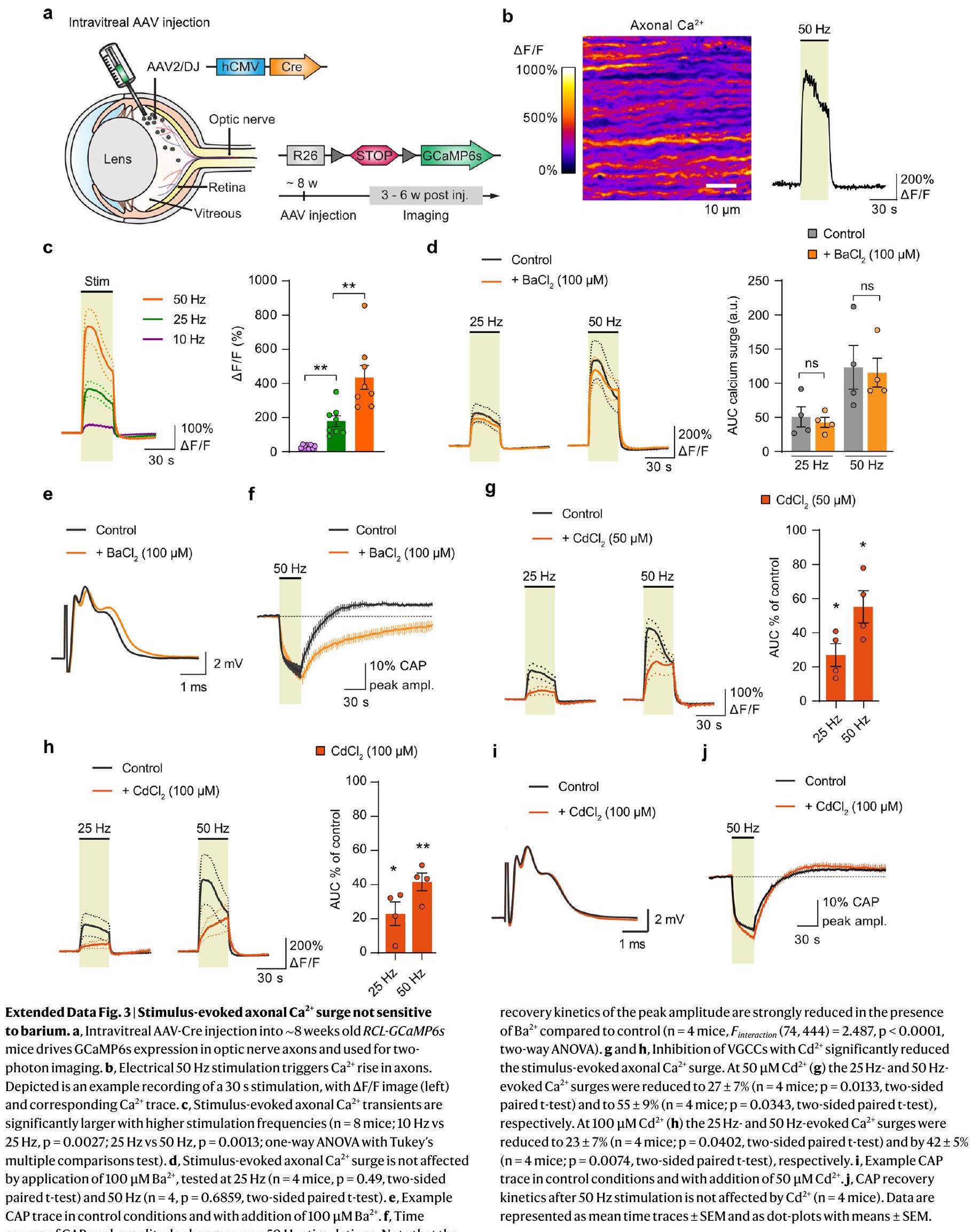 قد يؤدي إزالة الاستقطاب في OL إلى تنشيط قنوات الصوديوم المعتمدة على الجهد قنوات الكالسيوم المعتمدة على الجهد (VGCCs). قمنا باختبار مجموعة متنوعة من مثبطات قنوات الكالسيوم المعتمدة على الجهد، بما في ذلك الكادميوم ( النيكل )، نيفيديبين، بينيديبين وريد الروديوم (RuR؛ الشكل البياني الموسع 4a-e)، من بينها فقط وكان للنيفيديبين تأثيرات طفيفة (الشكل البياني الممتد. ). على النقيض، لم يؤثر علىزيادة (الشكل 4a من البيانات الموسعة) ولكنها قللت بوضوح من الاستجابة المحفزة للأكسوناستجابة (الشكل البياني الموسع 3g، h). وهذا يشير إلى أن المحور العصبيالزيادة خلال النشاط الكهربائي يتم توسيعها بواسطة قنوات الكالسيوم المعتمدة على الجهد، على عكس OLاستجابة. علاوة على ذلك، كانت استعادة موصلية CAP المتأخرة بعد التحفيز عالي التردد محددة لـ (الشكل 3f من البيانات الموسعة) وليس متأثراً بـ (الشكل 3i، j من البيانات الموسعة).