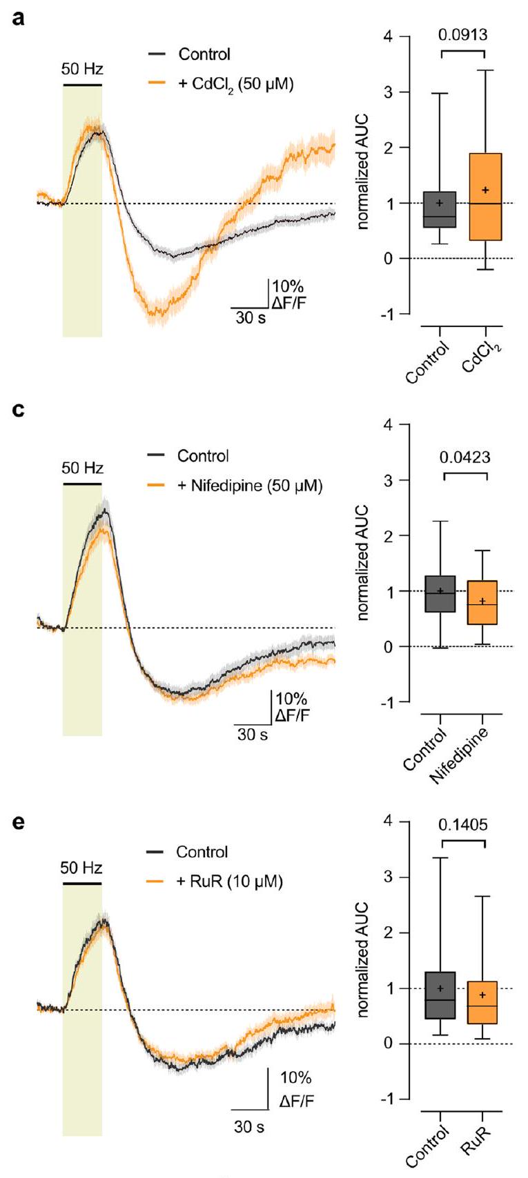 by cells from 3 mice, two-sided paired t -test . , OL response with Benidipine ( ) revealed no overt change in the 50 Hz -evoked surge ( cells from 3 mice, two-sided paired t-test). e, OL Ca response with RuR ( ) revealed no significant changes in the 50 Hz -evoked surge ( cells from 4 mice, two-sided paired t -test). Traces represent mean SEM. Boxplots show median (line), quartiles (box bounds), mean (+), and 5-95 percentiles (whiskers).