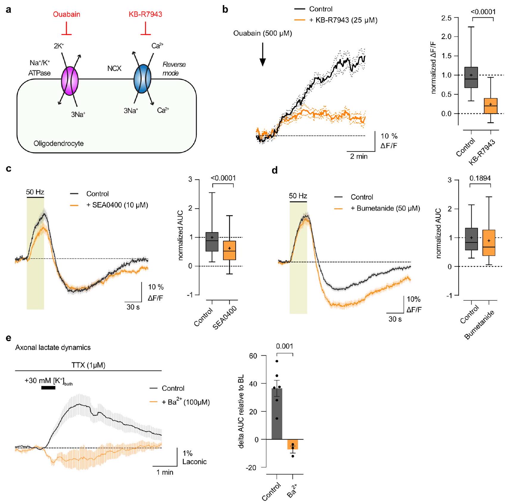 Extended Data Fig. 5 | Reverse-mode NCX activation in OL response and extracellular -induced lactate surge in axons. a, Schematic of reverse-mode NCX activity testing in OLs: Blocking the sodium pump with Ouabain raises intracellular concentration, which should activate NCX to exchange out for in. The ouabain-evoked is expected to be reduced by blocking NCX with KB-R7943. b, Indeed, ouabain application resulted in increased levels in OLs, significantly reduced with M KB-R7943 ( cells from 2 mice, p < 0.0001, two-sided paired t-test). c, 50 Hz -evoked OL response with NCX blocker SEA0400 ( ) revealed a significant decrease in surge by ( cells from 4 mice, , two-sided paired t -test). d, OL response