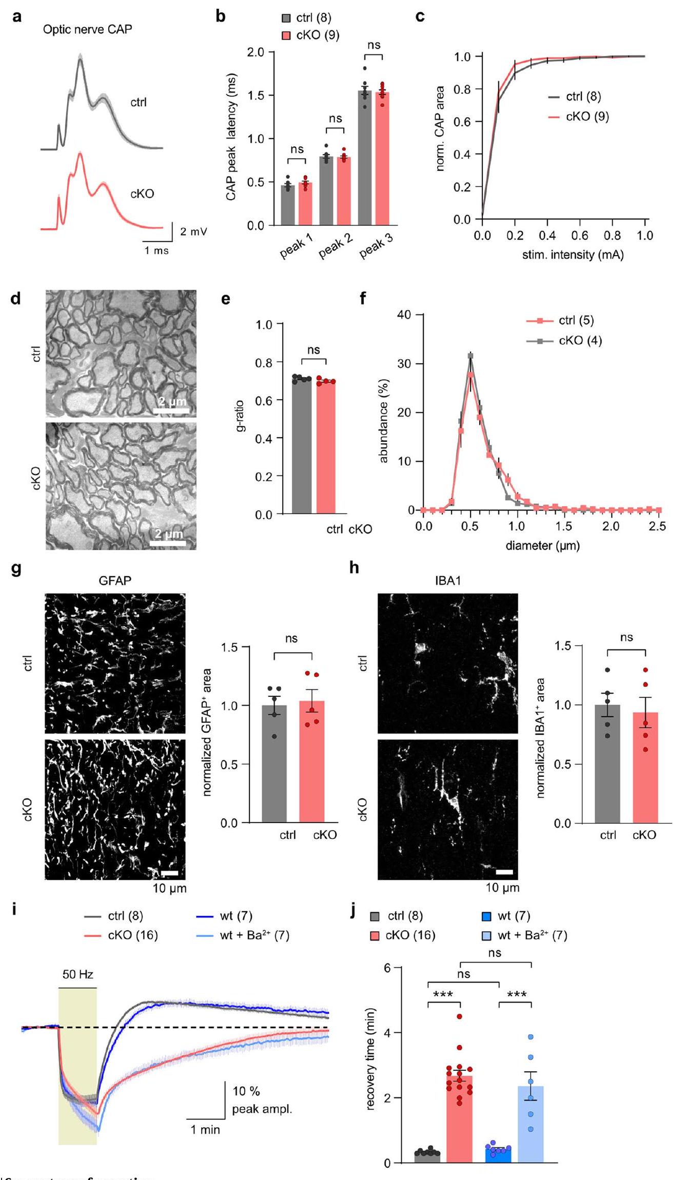 ANOVA). and , Confocal images of optic nerve immunolabeling: g, GFAP; , IBA1, in 2.5-months-old ctrl and cKO mice. No differences in GFAPimmunopositive area between genotypes ( , two-sided Student’s t-test), or IBA1 labeling (ctrl, ; cKO , two-sided Student’s t-test). i, Averaged CAP amplitude changes (% from baseline) upon 1 min 50 Hz stimulation of optic nerves from cKO, ctrl, wildtype (wt) and wt treated with , CAP peak recovery time post 50 Hz stimulation: Slower recovery in CKO ( mice) and compared to and wt ( ) (ctrl vs cKO, ; wt vs wt ; ctrl vs wt, ; cKO vs wt ; one-way ANOVA with Holm-Šídák’s multiple comparisons test). Data represented as means SEM.